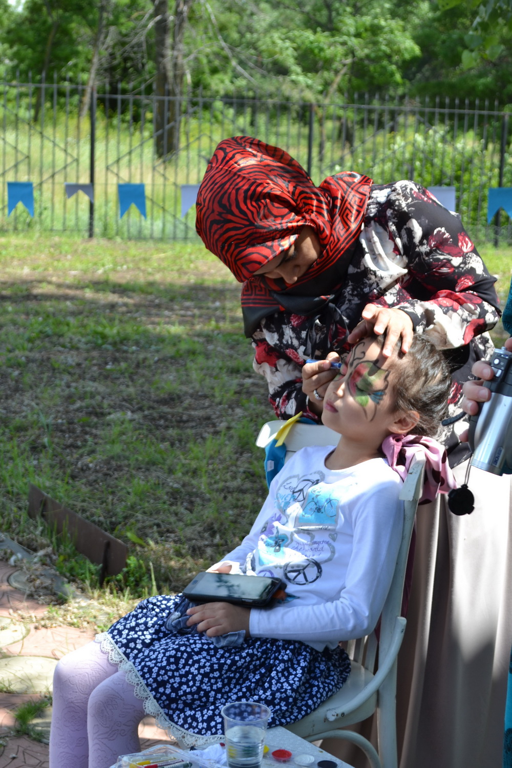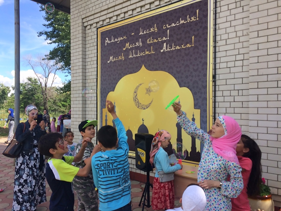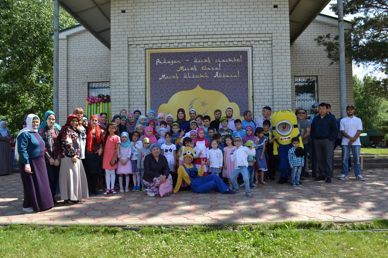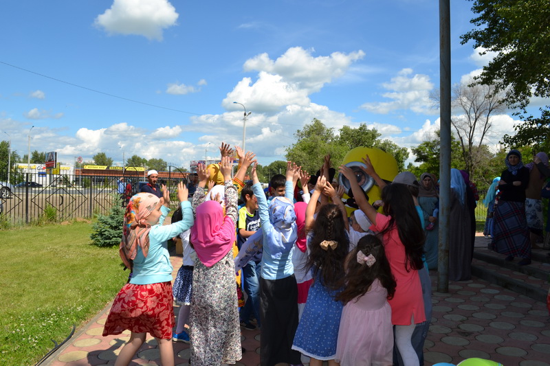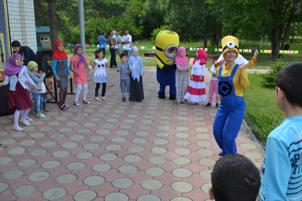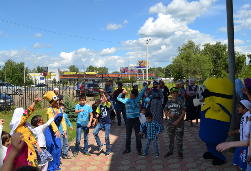 В этот день территория мусульманского храма была разделена по игровым зонам. На детской площадке мальчиков и девочек развлекали аниматоры и мультгерои «Миньоны». Вместе с ними ребята приняли участие в спортивной эстафете, подвижных играх и конкурсах.