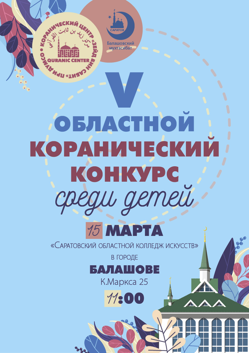 15 марта в г. Балашов состоится V Областной Коранический конкурс среди детей.  Организаторами мероприятия выступают коранический центр «Зейд бин Сабит» при ДУМСО совместно с Балашовским мухтасибатом.
