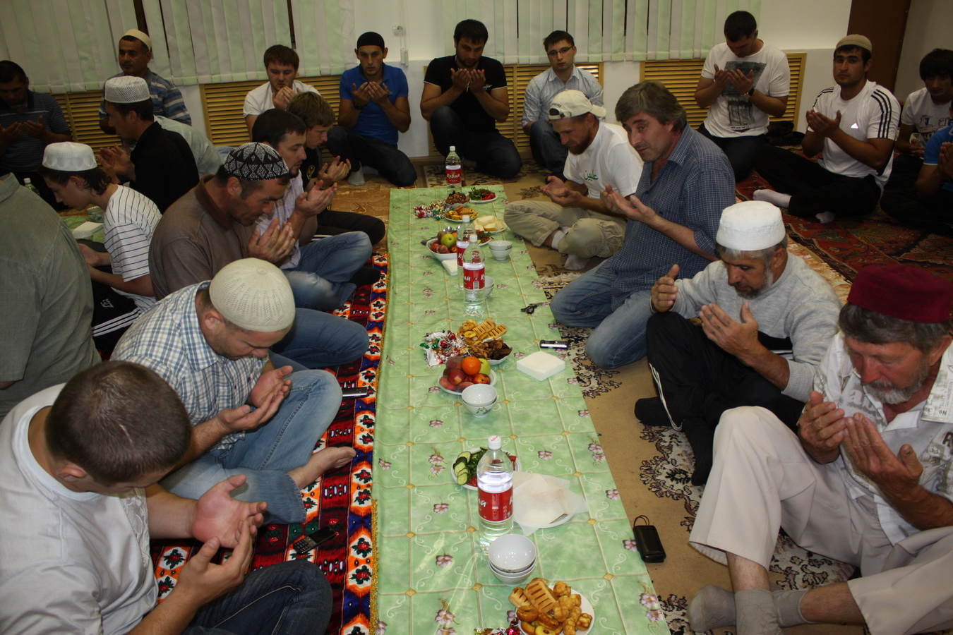С заходом солнца постящиеся совершили Магриб-намаз и приступили к трапезе, во время которой каждый смог отведать вкусный плов и другие блюда.