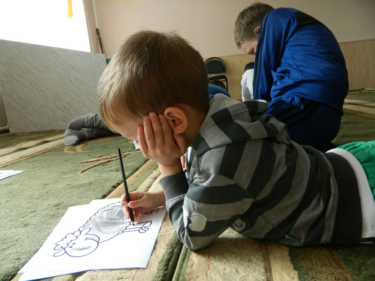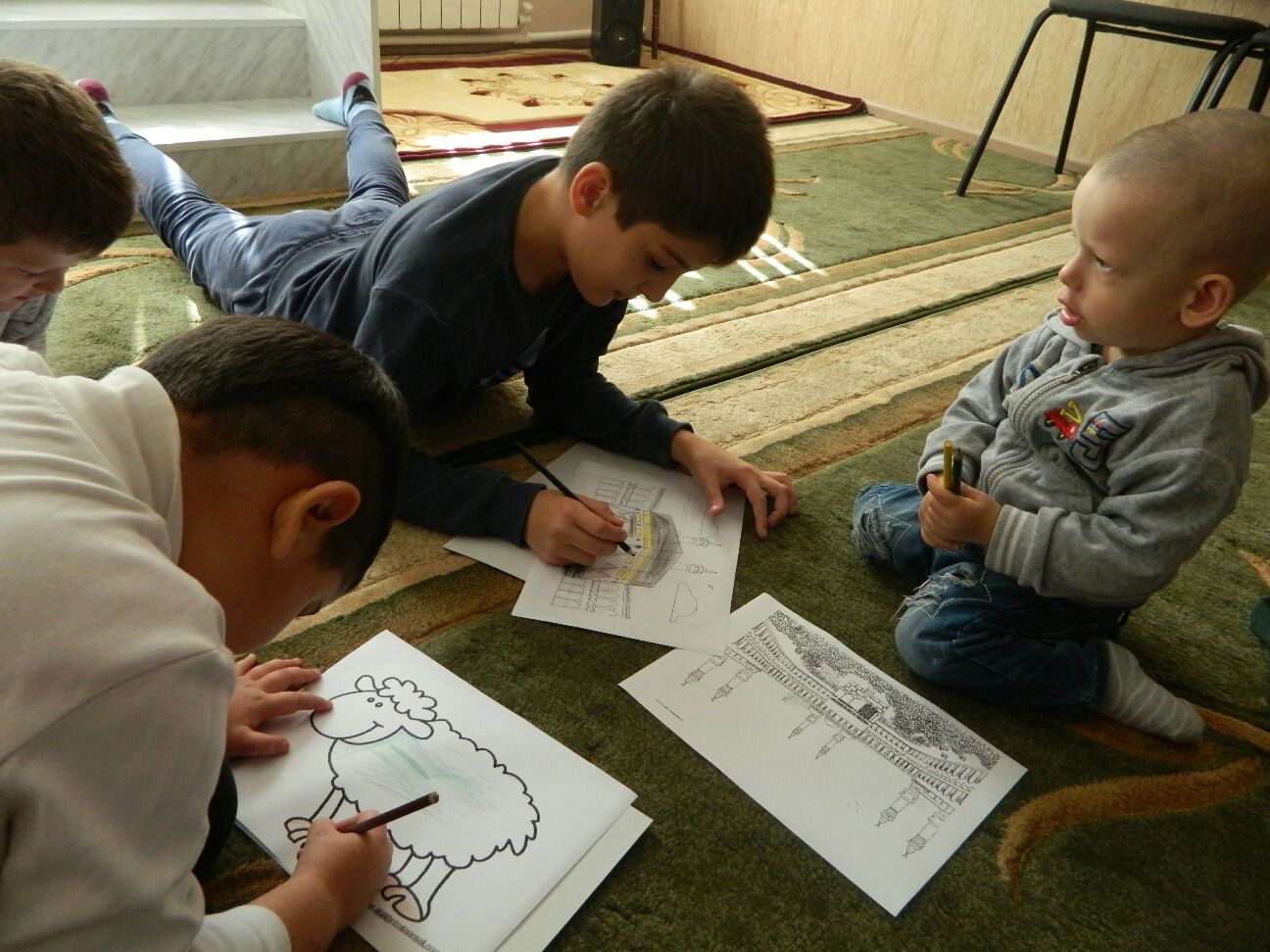 Встреча продолжилась интересными загадками, которые детям предстояло разгадать. Кроме того организаторы дали волю детскому творчеству: каждый из маленьких гостей раскрасил свой рисунок на тему Курбан-байрама, а позже эти творения украсили стены родной мечети.