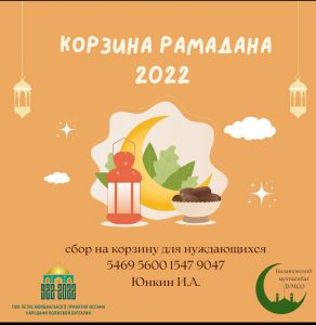 Напомним, внести свой вклад в благотворительную акцию «Корзина Рамадана» может любой желающий, перечислив средства на карту 5469 5600 1547 9047 (Ильяс Адельшинович Ю.).