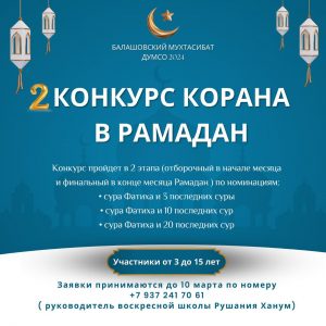 Заявки принимаются до 10 марта 2024 года по телефону: +7 937 241 70 61, преподаватель воскресной школы при Соборной мечети г.Балашова Рушания-ханум Юнкина.