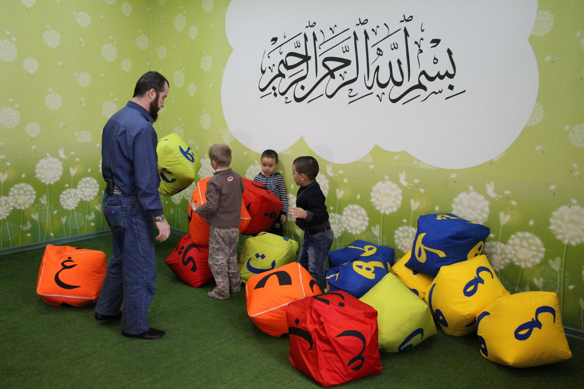 Примечателен и интерьер классов для детей. Заходя сюда, ребенок ощущает себя, словно в игровой комнате, разумеется, покидать которую малышу не захочется. Декор стилизован под небольшую лесную полянку: повсюду зелень, солнечный свет, даже обычный шкаф превращен в большое дерево. Дверь, которую установили в этом году, также необычна – будучи стеклянной, она содержит в себе интересные узоры и полный арабский алфавит. Это сделано для того, чтобы визуально малыш смог привыкнуть и запомнить сложные на первый взгляд причудливые арабские узоры, так непохожие на кириллицу.