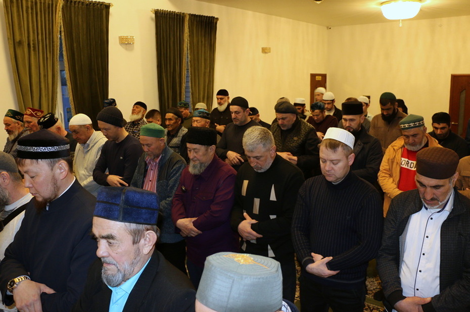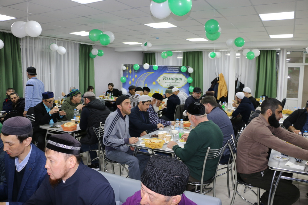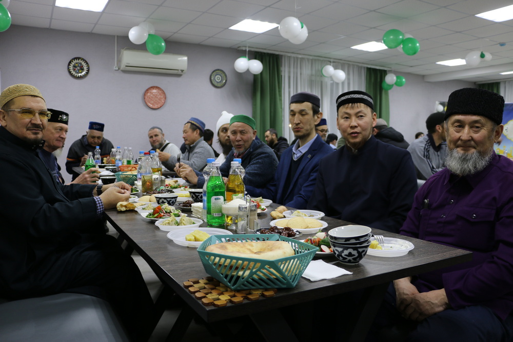 С заходом солнца и азаном на вечерний намаз постящиеся прервали уразу. Они совершили коллективный Магриб-намаз в Соборной мечети г.Ершова.