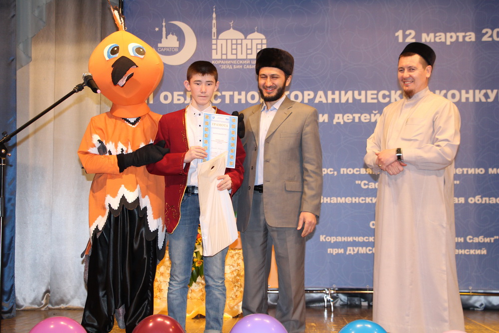 Конкурс завершился церемонией награждения участников. Но не только дети получили подарки. Расим-хазрат Кузяхметов вручил благодарственное письмо главе Ивантеевского района Василию Басову за содействие в организации мероприятия. Кроме этого ему подарили смысловой перевод Корана на русский язык.