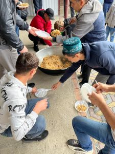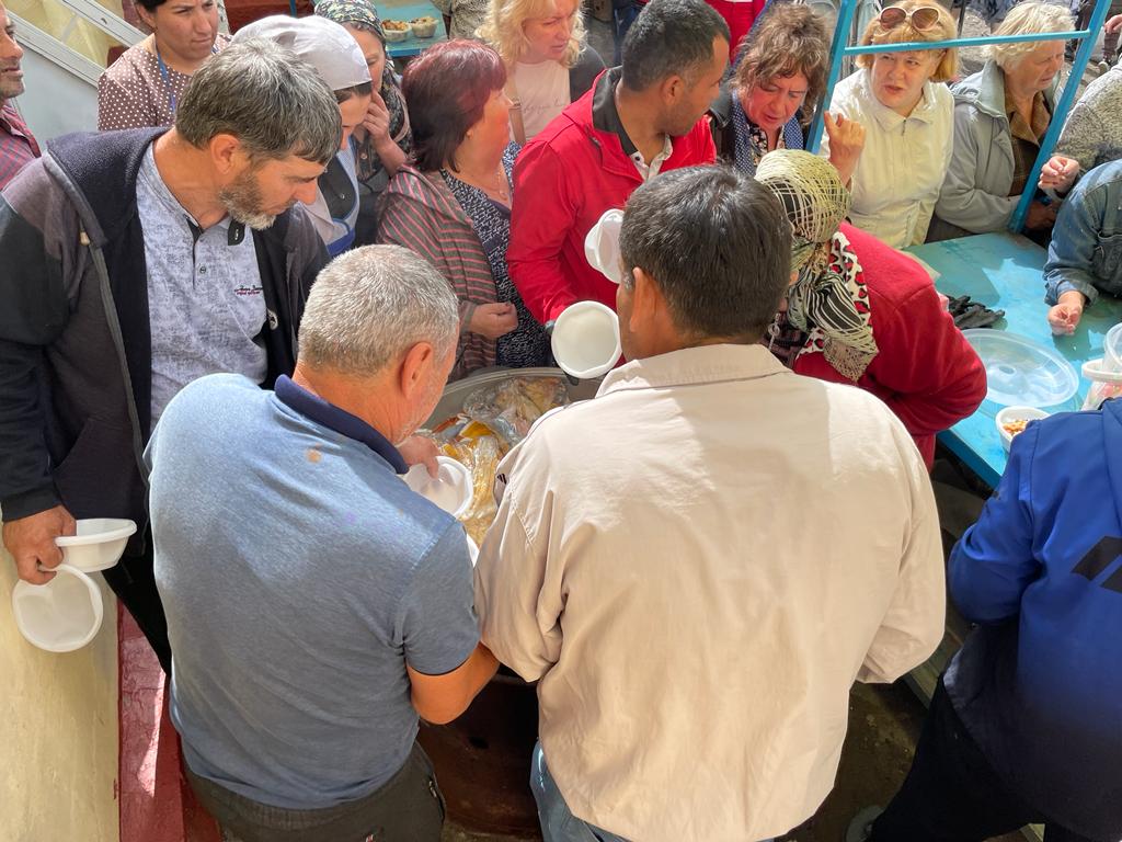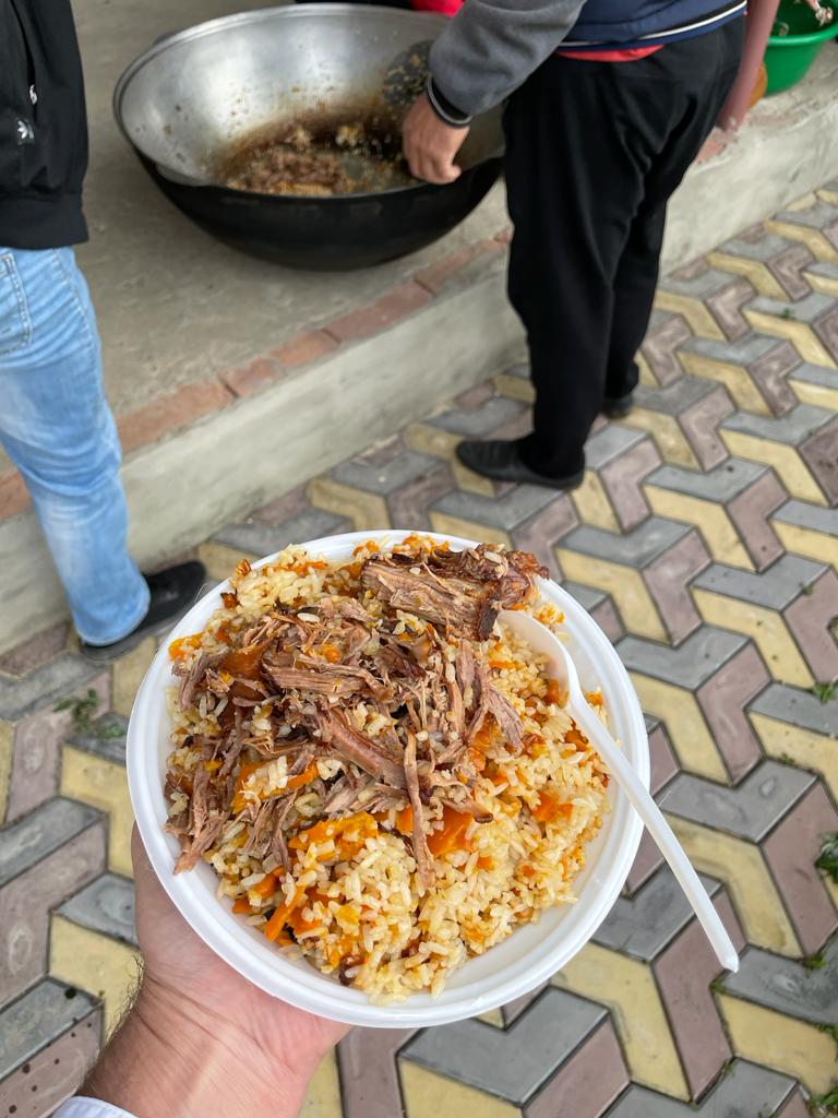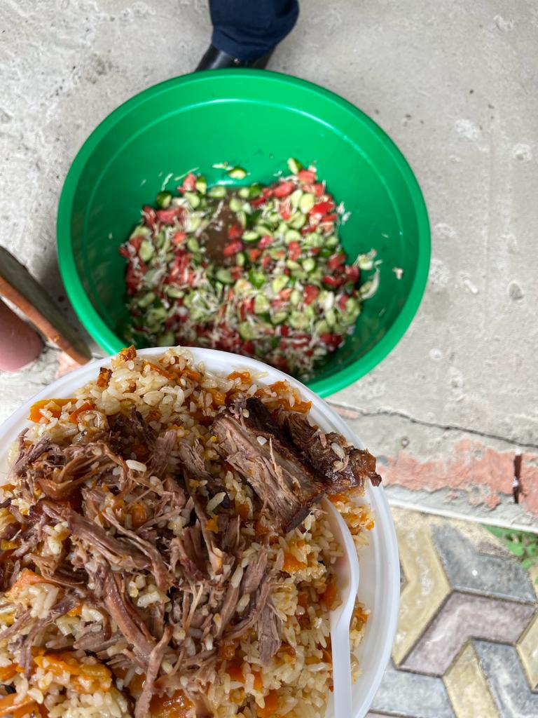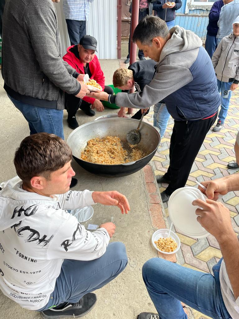 После совершения коллективной молитвы все желающие смогли отведать плов и салат во дворе мечети.