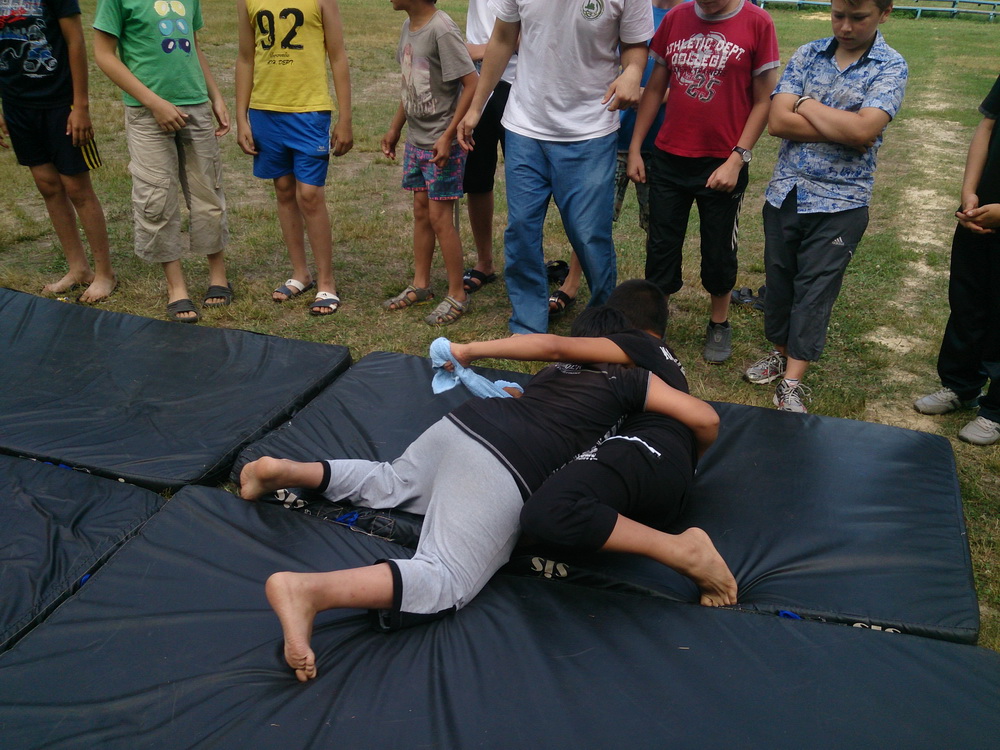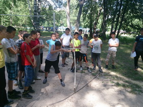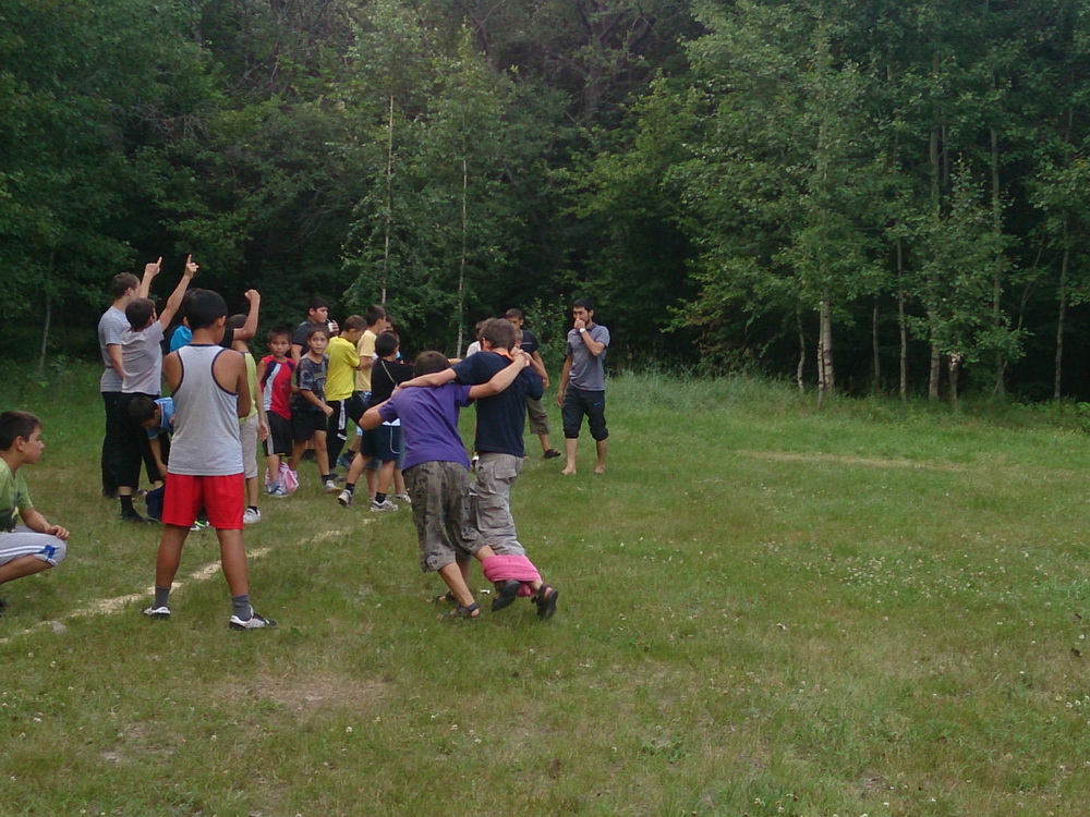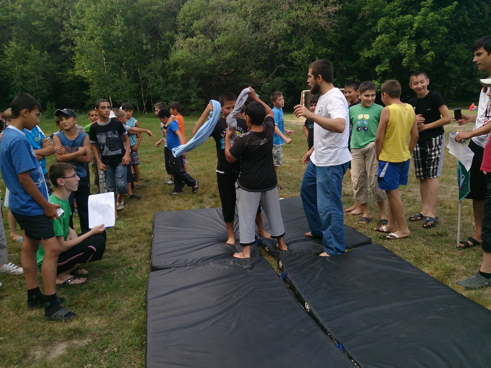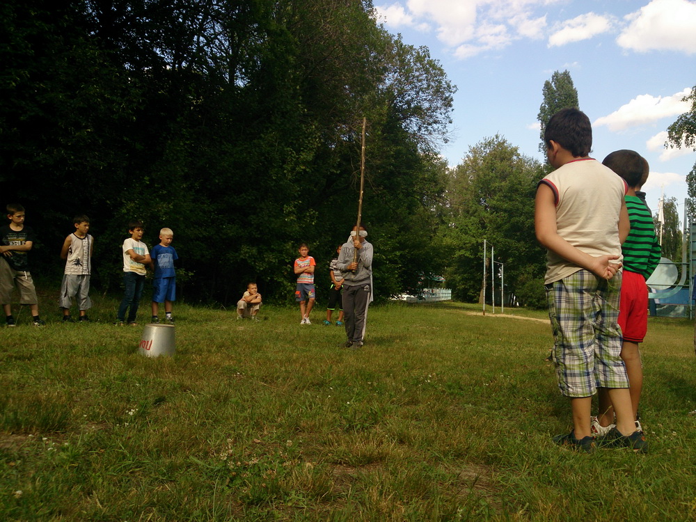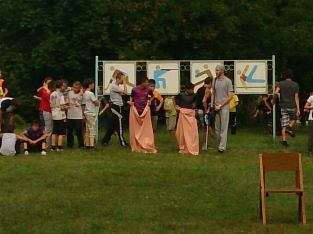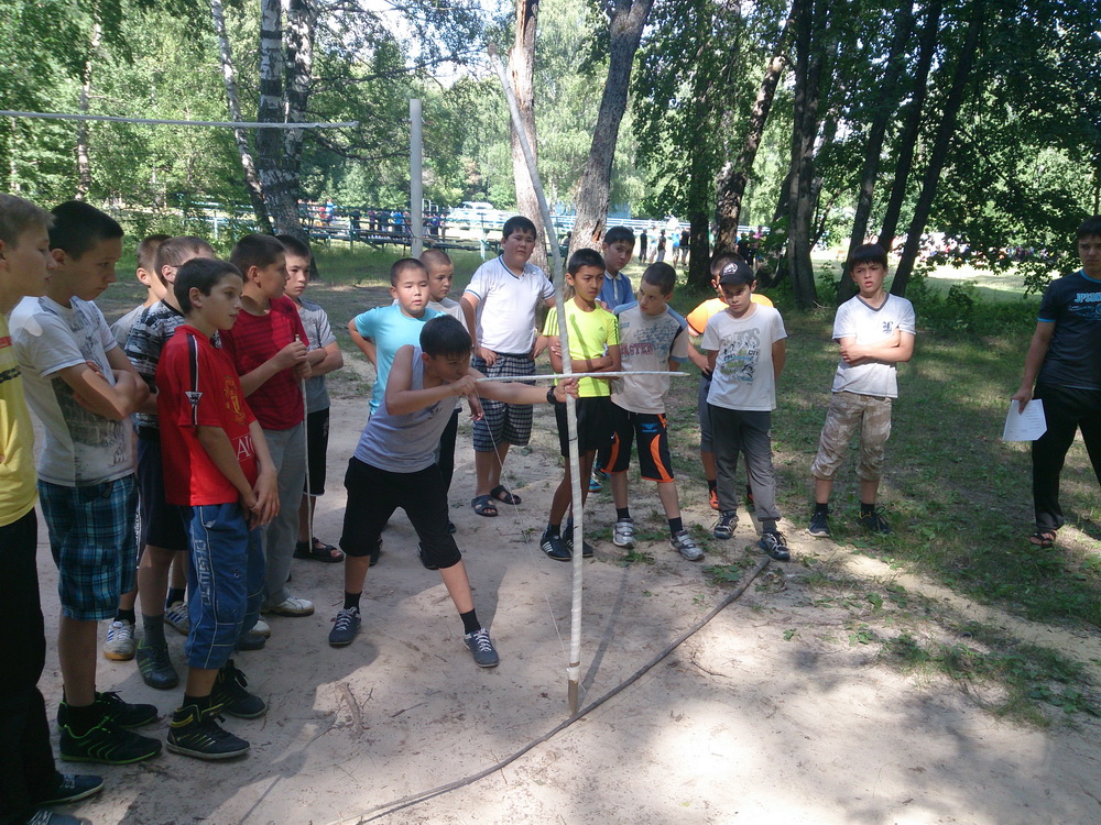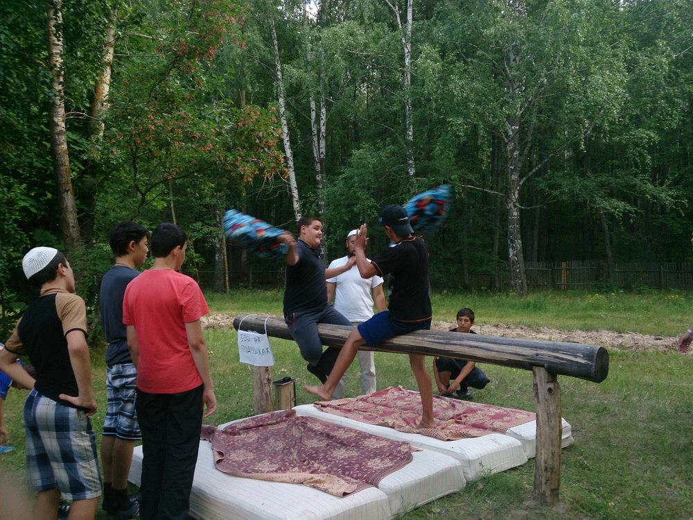 Вот у кромки поля вожатый Тахир устраивает бег в мешках, а там, на противоположной стороне ребята на бревне «поливают» друг друга ударами при помощи подушек. Устаз Рушан определяет лидеров в борьбе «куряш». Вожатый седьмого отряда Шамиль помогает детишкам разбивать горшок закрытыми глазами. На дальней волейбольной площадке Рашид-хазрат устроил стрельбу из лука. Лук получился раза в два больше самих стрелков,  тем не менее, некоторым удалось попасть прямо в «яблочко».