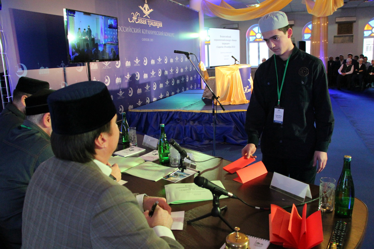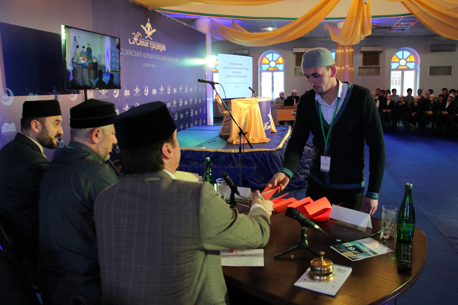 Они предлагали конкурсантам билеты с заданиями на выбор и внимательно слушали их ответы, оценивая их по нескольким критериям: знание текста, правильность чтения (таджвид), красота голоса и этикет чтения.