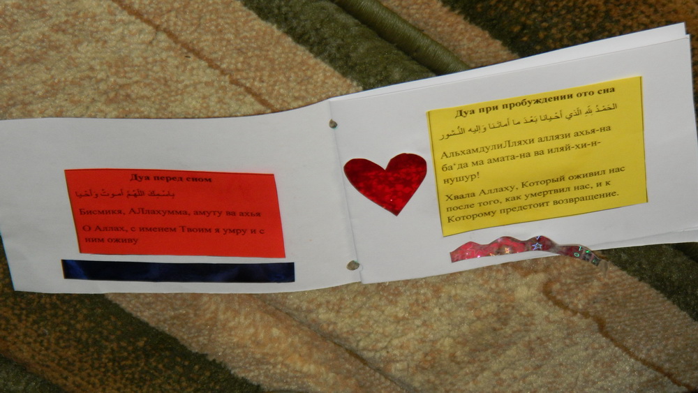 Для закрепления полученных знаний ребята под руководством взрослых начали делать свою собственную книжку (лэпбук) с суннами посланника Аллаха, в которую внесли пару дуа. Кроме этого, дети получили домашнее задание – заполнить книжку с молитвами для разных случаев жизни и выучить их.
