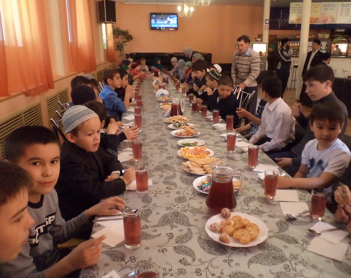 После совместного обеденного намаза торжество продолжилось в местном кафе, где детей помимо традиционных мусульманских блюд угостили мороженым.
