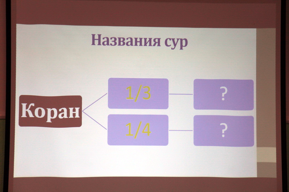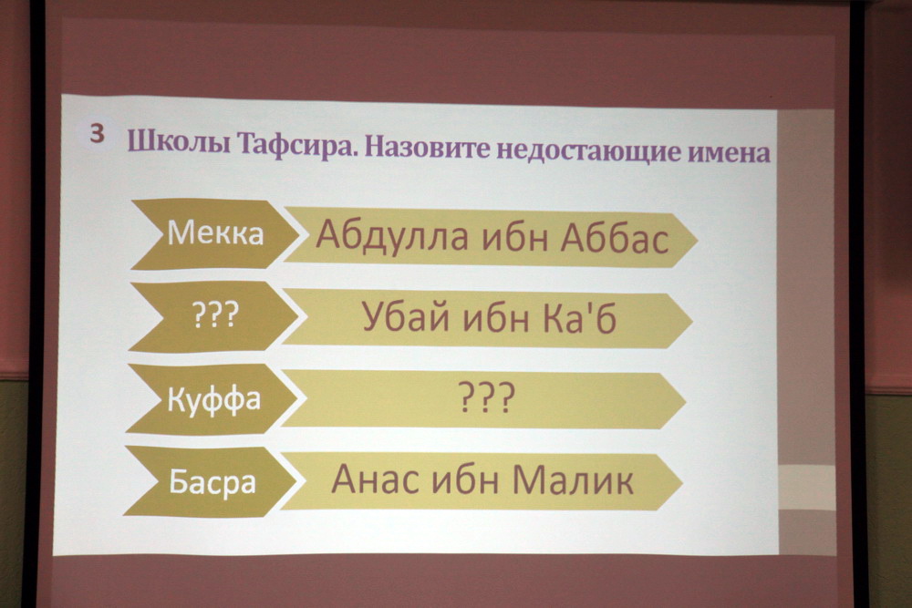 В викторине приняли участие три команды, которые представляли второй и третий курсы вечернего отделения медресе. Студенты продемонстрировали свои знания по таким предметам, как толкование Священного Корана и хадисоведение, отвечали на вопросы по истории Ислама и первых мусульман. Некоторые из заданий были в виде ребусов.