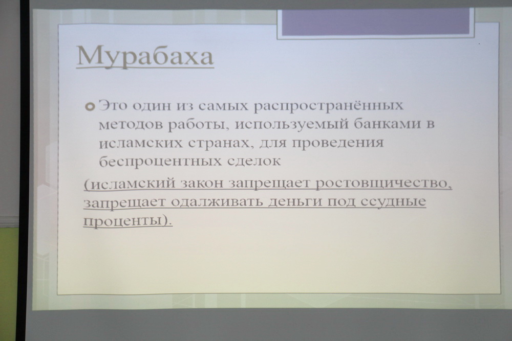 Однако проблема приобретения собственного жилья, автомобиля или открытия бизнеса стоит остро в наши дни и среди мусульман. Решать данные вопросы верующие стараются в рамках дозволенных экономических операций и услуг. В ходе мероприятия участники круглого стола познакомились с такими понятиями, как мурабаха, мушарака, мудараба и иджара. Данные виды финансовых сделок приводят клиента к желаемому результату, не нарушая норм шариата и не принося убытки экономике.