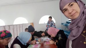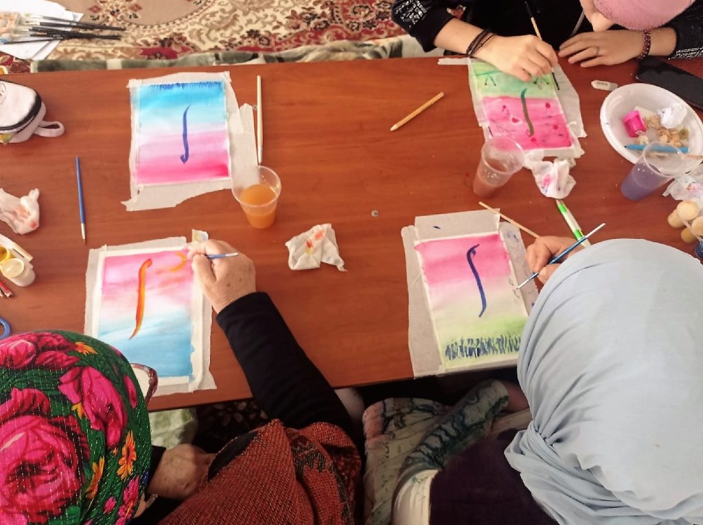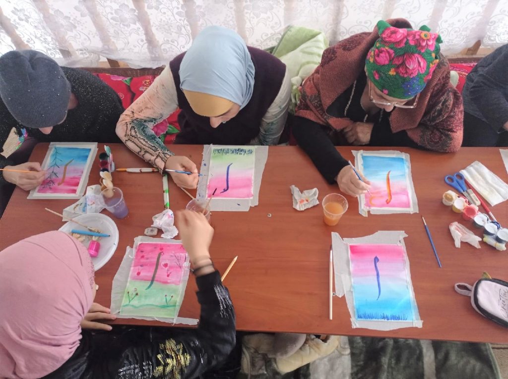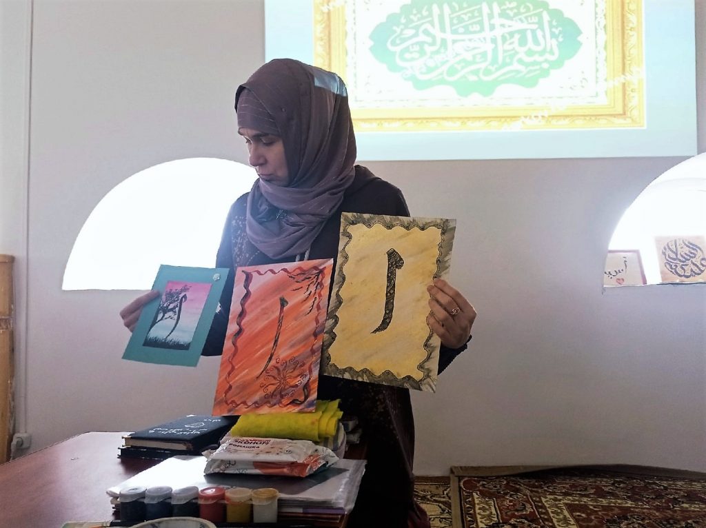 После этого Альфия-ханум Каримова показала несколько методик написания арабских букв. На мастер-классе местные мусульманки совместили рисование акварелью и каллиграфию. С помощью техники двух карандашей они написали первую букву арабского алфавита «Алиф».