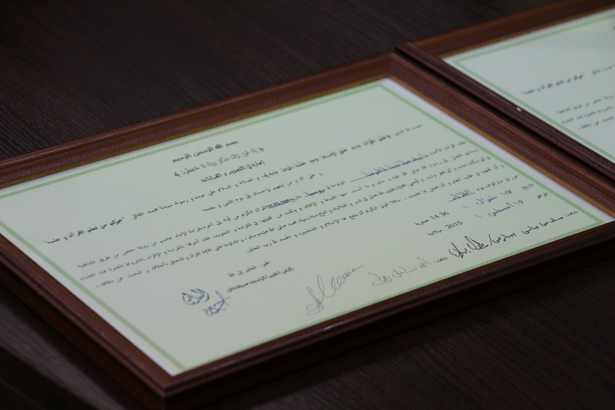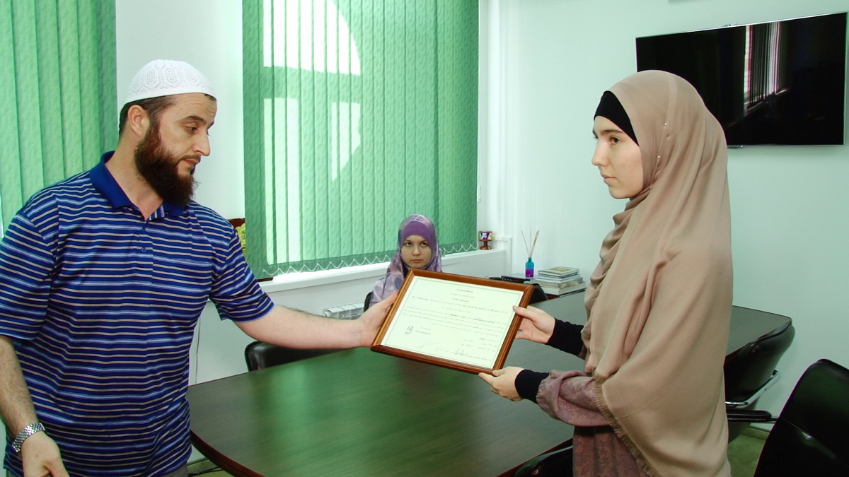 Перед вручением иджазы (специального сертификата) мусульманки прочитали последние суры и процитировали «Аль-Фатиху». Затем Ильяс-хазрат зачитал документ, в котором свидетельствуется, что Амина и Дания знают весь текст Корана, прочитали его от начала до конца со всеми правилами таджвида перед учителем, а также достигли уровня, позволяющего им самим обучать Священному Писанию других.