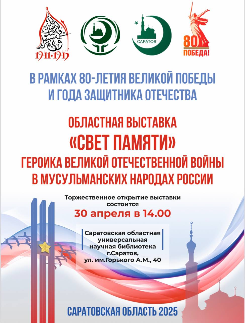 30 апреля 2025 года в Саратове состоится открытие областной выставки «Свет памяти: Героика Великой Отечественной войны в мусульманских народах России», которая проводится в рамках мероприятий в честь 80-летия Великой победы и Года защитника Отечества. Организатором выступает ДУМ Саратовской области при поддержке благотворительного фонда «Юмарт».