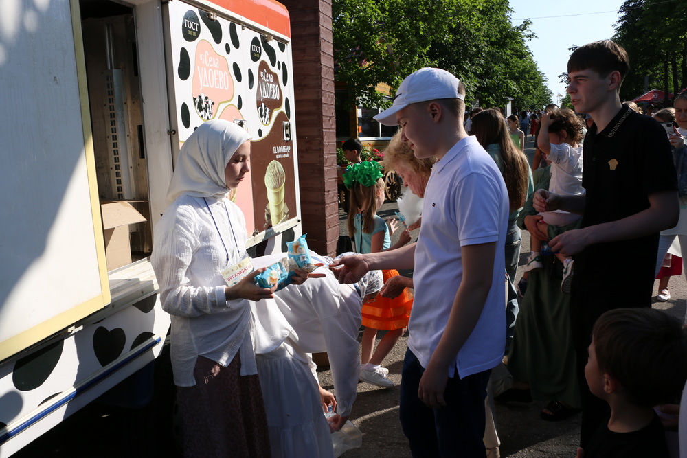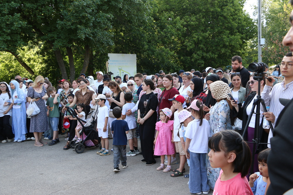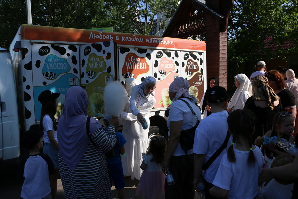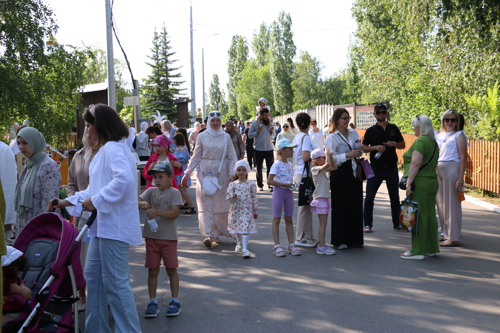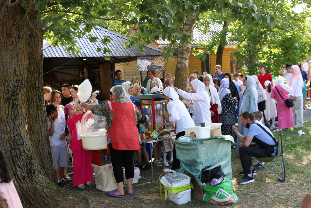 Вдоль основной аллеи раскинулись ряды «Базара милосердия» — здесь можно было приобрести сувениры, шамаили, платки и изделия ручной работы. В национальных подворьях всем предлагали отведать праздничные блюда.