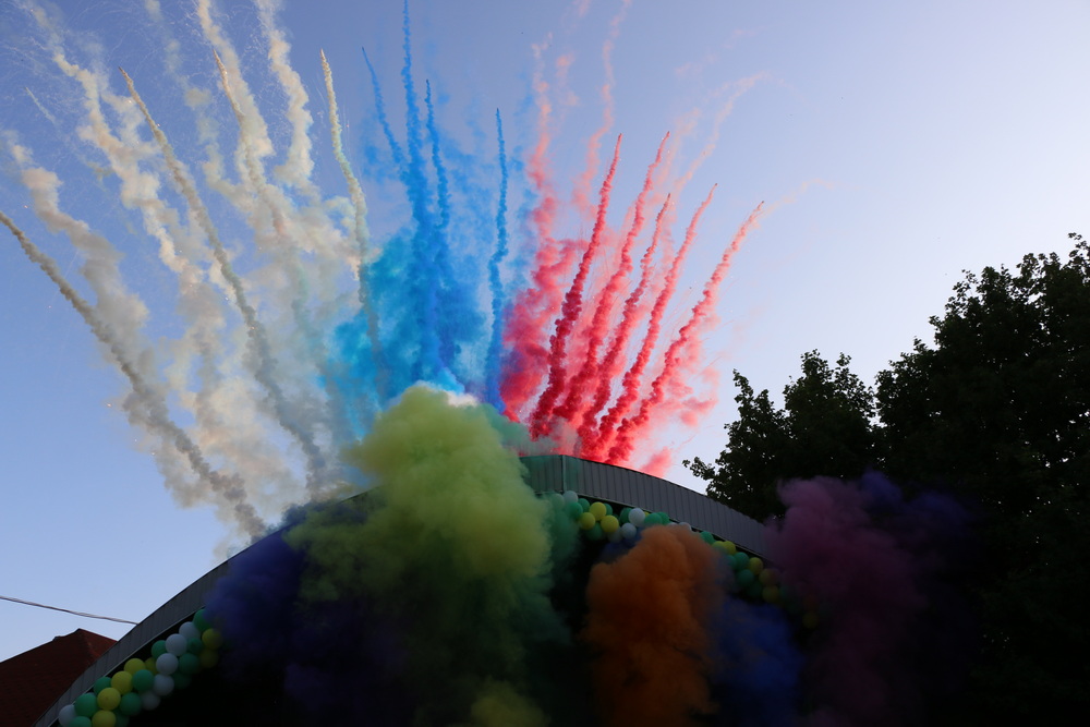 Итогом вечера стал дымный фейерверк в цветах триколора, пространство перед сценой также украсили разноцветные дымные вспышки.