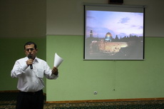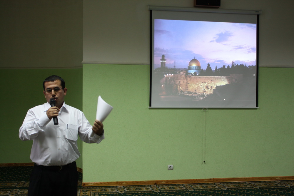 Разговор об истории мечети в Иерусалиме и многочисленных попытках ее разрушения продолжил преподаватель медресе «Шейх Саид» доктор Нидаль Эль-Хих. После демонстрации тематического фильма он наглядно с помощью слайдов раскрыл все детали происходящего. По его словам, сегодня развернута полномасштабная деятельность по разрушению этого храма: врагами Ислама подменяются понятия в СМИ, переписывается история этой местности, сочиняются мифы, что способствует искажению представления о реальной ситуации на палестинских землях. В результате подобной пропаганды многие, в том числе мусульмане, ошибочно воспринимают мечеть «Купол скалы» (та, которую мы привыкли видеть на фотографиях с золотистым куполом) за мечеть аль-Акса. А пока наше внимание отвлечено, древнейшая мечеть и третья святыня мусульман подвергается разрушению под предлогом «археологических раскопок».