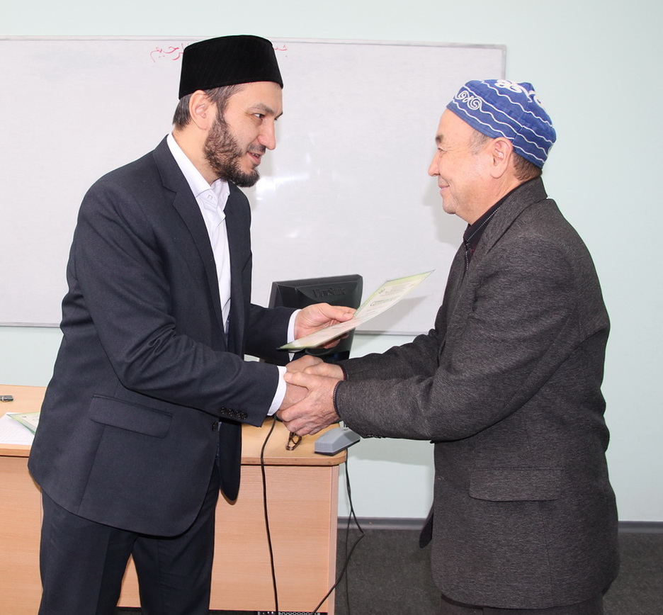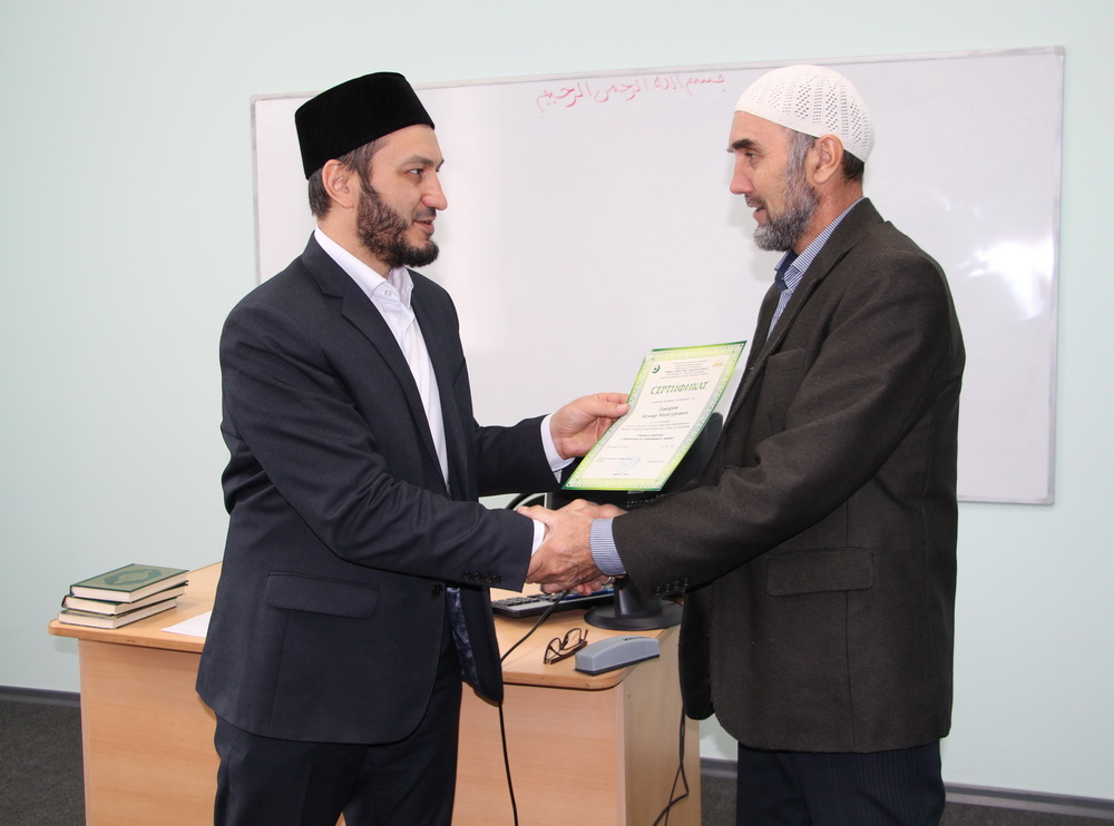 В последний день курсов состоялось вручение сертификатов. В минувший выходной директор медресе «Шейх Саид» Расим-хазрат Кузяхметов еще раз напомнил слушателям курсов, что цель семинаров – не просто повысить уровень знаний имамов, а дать импульс для их дальнейшего развития и повышения качества работы. «Имам – это представитель Ислама на местах. На него ориентируются местные мусульмане», — подчеркнул Расим-хазрат и выразил надежду, что полученные знания во время курсов принесут пользу многим людям.