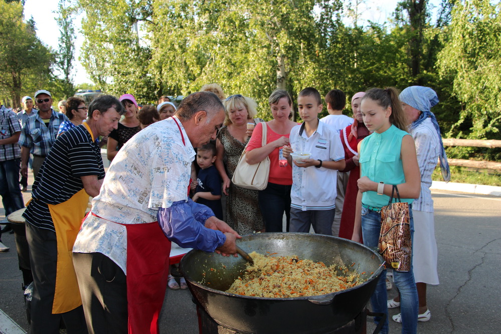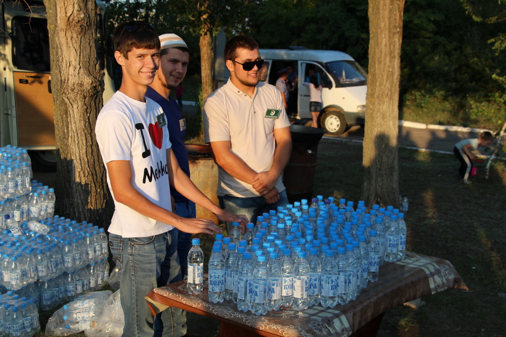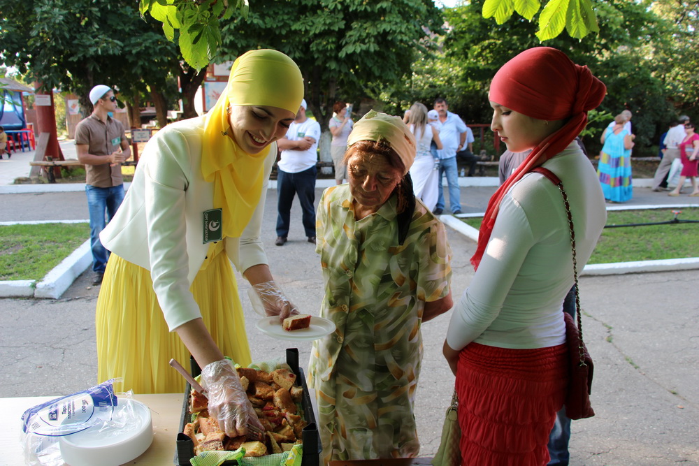 Родители с удовольствием наблюдали за радостными детками. Однако и о них организаторы позаботились. Каждый гость мог попробовать порцию вкусного плова, приготовленного мусульманами на костре, также им была предложена минеральная вода и национальные татарские пироги.
