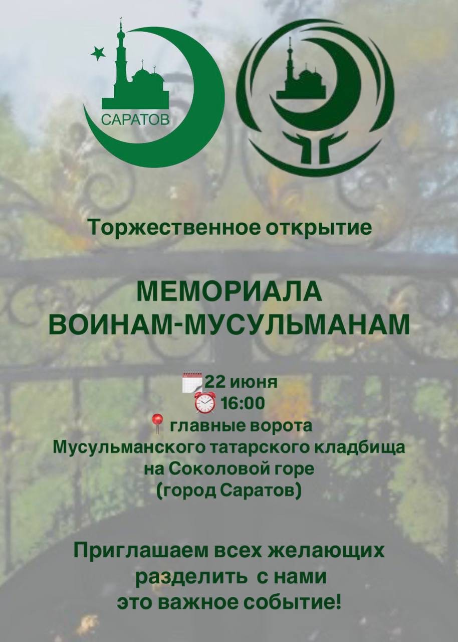 Духовное управление мусульман Саратовской области приглашает всех желающих на торжественное открытие мемориала, посвященного памяти воинов-мусульман, героически сражавшихся за нашу Родину в годы Великой Отечественной войны.