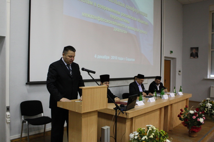 4 декабря, в Саратове прошла межрегиональная конференция “Ислам в современном российском обществе. Перспективы межконфессионального и межкультурного диалога”, организованная Духовным управлением мусульман Поволжья при содействии Фонда поддержки исламской культуры, науки и образования. Для участия в работе мероприятия приехали гости со всех уголков страны и даже из-за рубежа: глава комитета по тренингу Международного центра “Аль-Васатыйа” в Кувейте доктор Салим аль-Баянуни, министр-председатель комитета общественных связей и национальной политики правительства саратовской области Сергей Авезниязов, муфтий Мордовии Рашид-хазрат Халиков, представитель Саратовской епархии протоирей Дмитрий Усольцев, руководитель общественно-просветительской организации «Радуга» Рашид-хаджи Куряев, председатель президиума Московской коллегии адвокатов “Солидарность” Расул Кубанов, директор республиканского межконфессионального клуба “Согласие” Хаджимурат Хакуашев, проректор по научной работе Российского исламского университета Рустам-хазрат Батров, председатель МРОО “Исламский молодежный центр” Марат Салимов и др.