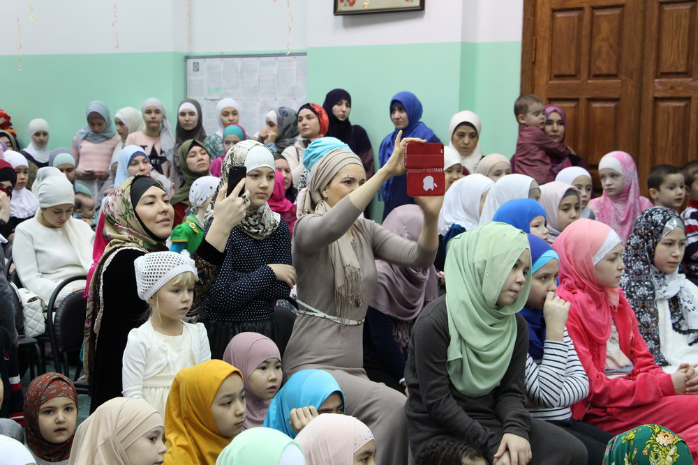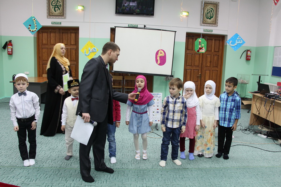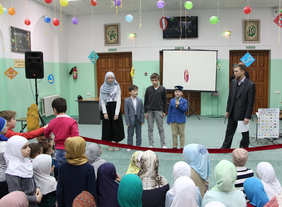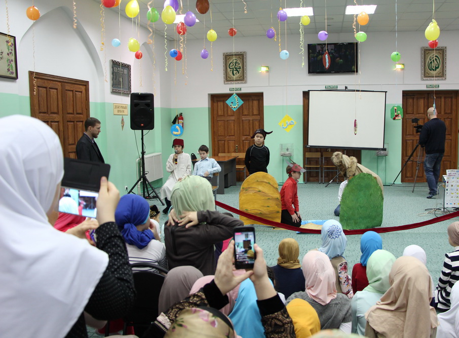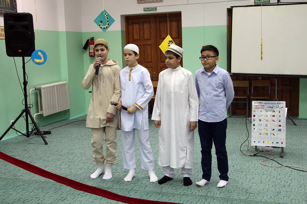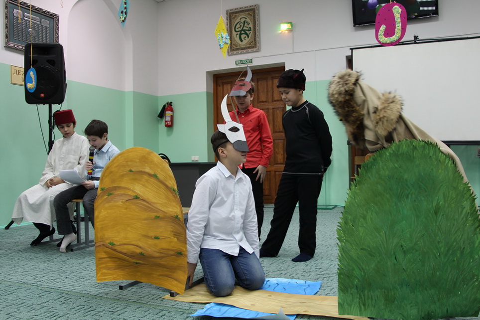 Затем ученики средней группы воскресной школы «Мактаб» рассказали гостям о важности изучения языка Священного Корана, а дети младшего возраста прочитали стихи о буквах арабского алфавита. Также юные мусульмане в красочных костюмах разыграли на арабском языке поучительную историю-сказку о льве и быках, после чего дети исполнили для собравшихся красивые нашиды.