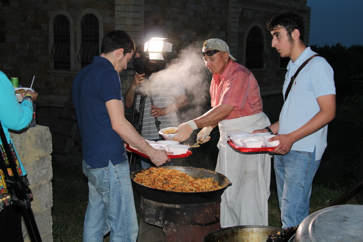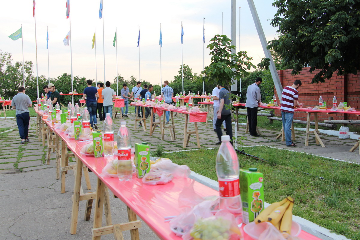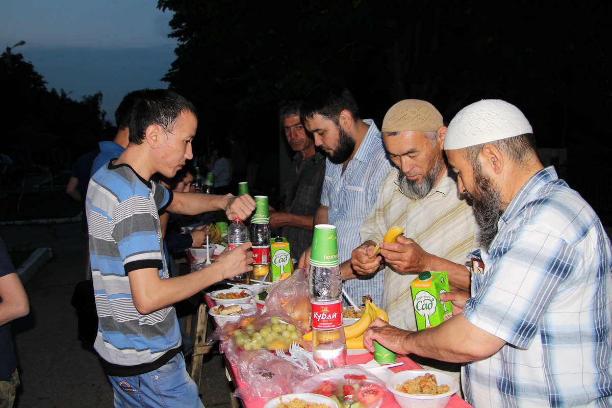 После этого для мусульман наступила долгожданная вечерняя трапеза. На столе их ждали фрукты и соки, салат и сладости, ну а коронным блюдом этого вечера стал ароматный узбекский плов.