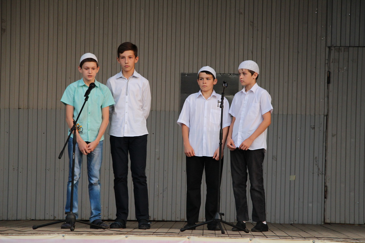 Далее на сцене появились малыши. Юные мусульмане прочитали стихотворения, поздравили всех и процитировали аяты Корана.