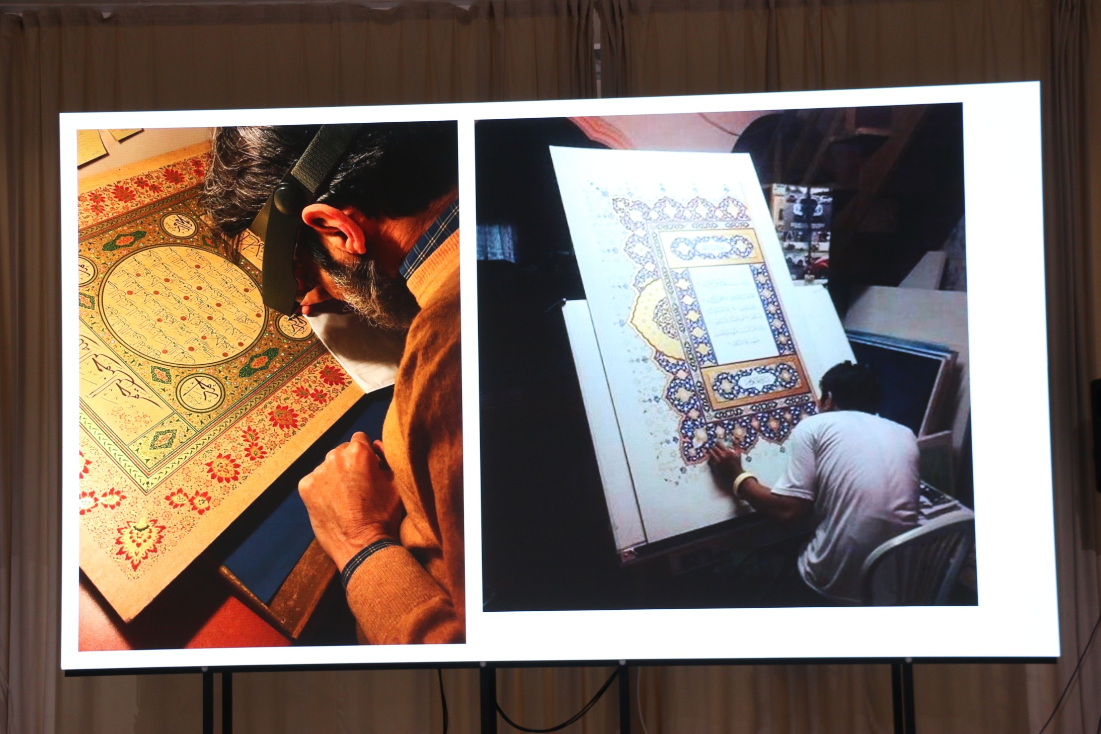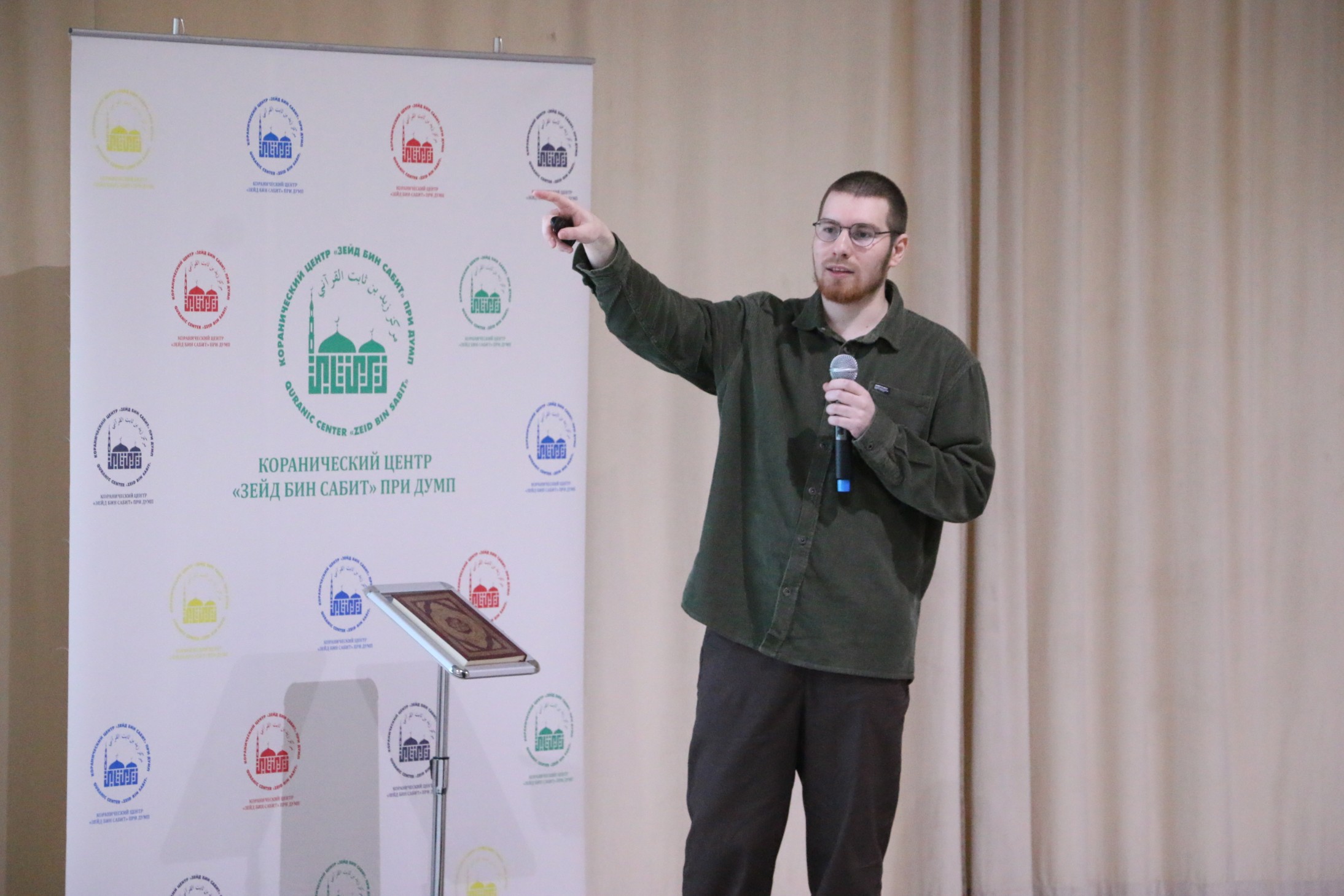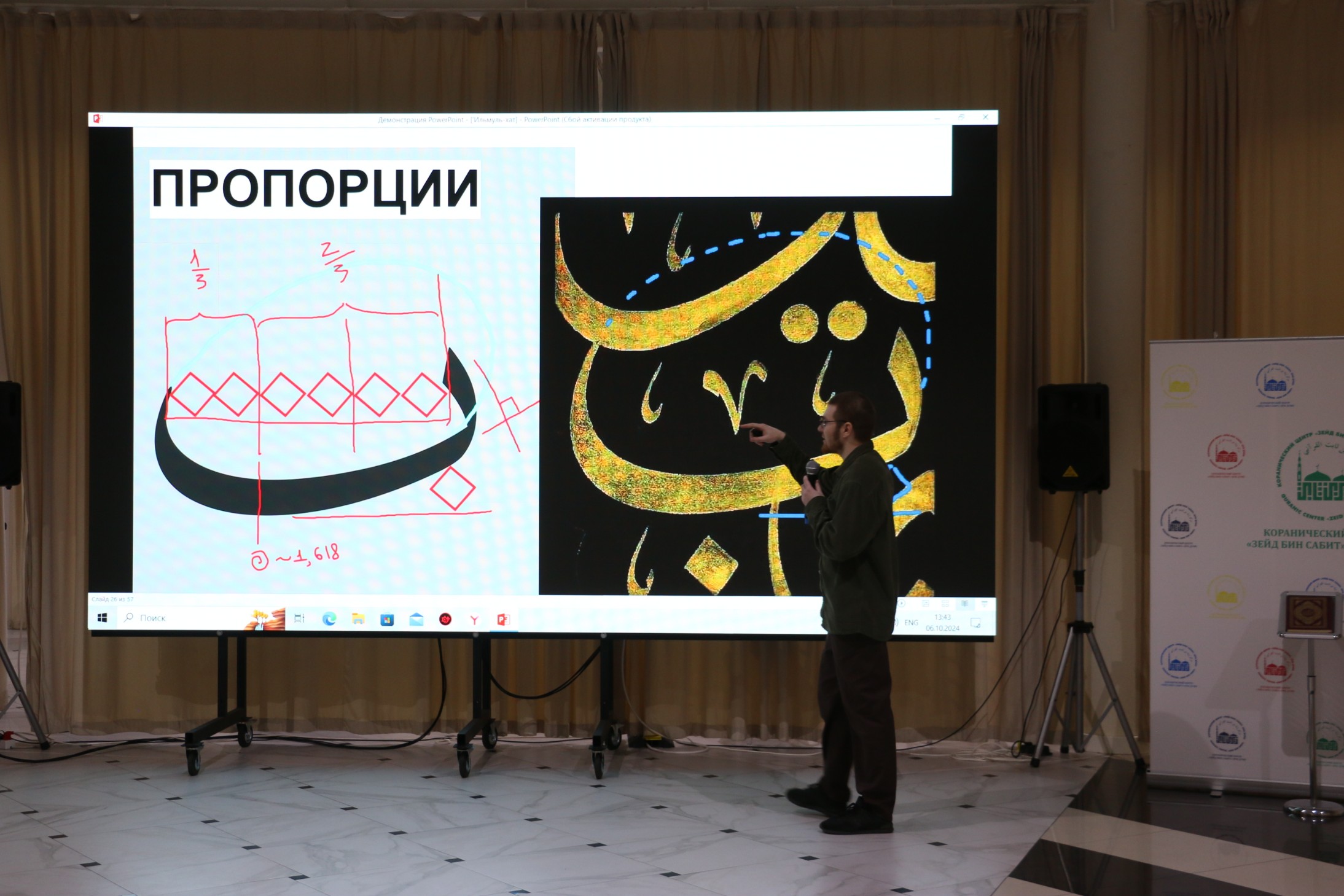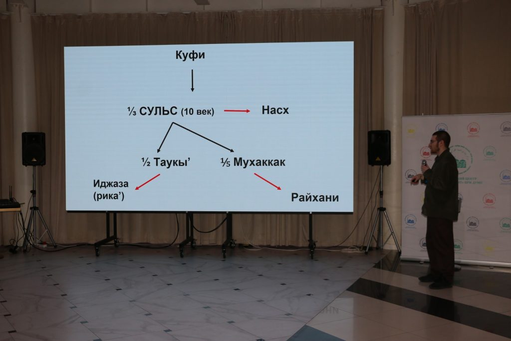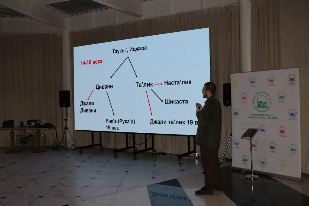 Затем слово передали основному спикеру – известному российскому каллиграфу, автору каллиграфии рукописного казанского Корана, обладателю иджазы по нескольким стилям каллиграфии Артуру Писаренко. Он отметил, что арабская каллиграфия — это классическая исламская наука и одновременно искусство. Ее родоначальником принято считать сподвижника пророка Мухаммада (мир ему), четвертого праведного халифа Али ибн Абу Талиба. Гость из Казани рассказал о зарождении и формировании стилей каллиграфического письма, с чем сталкивались известные хаттаты (ученые-каллиграфы) в разные времена и продемонстрировал эволюцию стилей на протяжении веков. Артур Писаренко подробно остановился на методиках написания и роли пропорций, а также способах развития каллиграфии.
