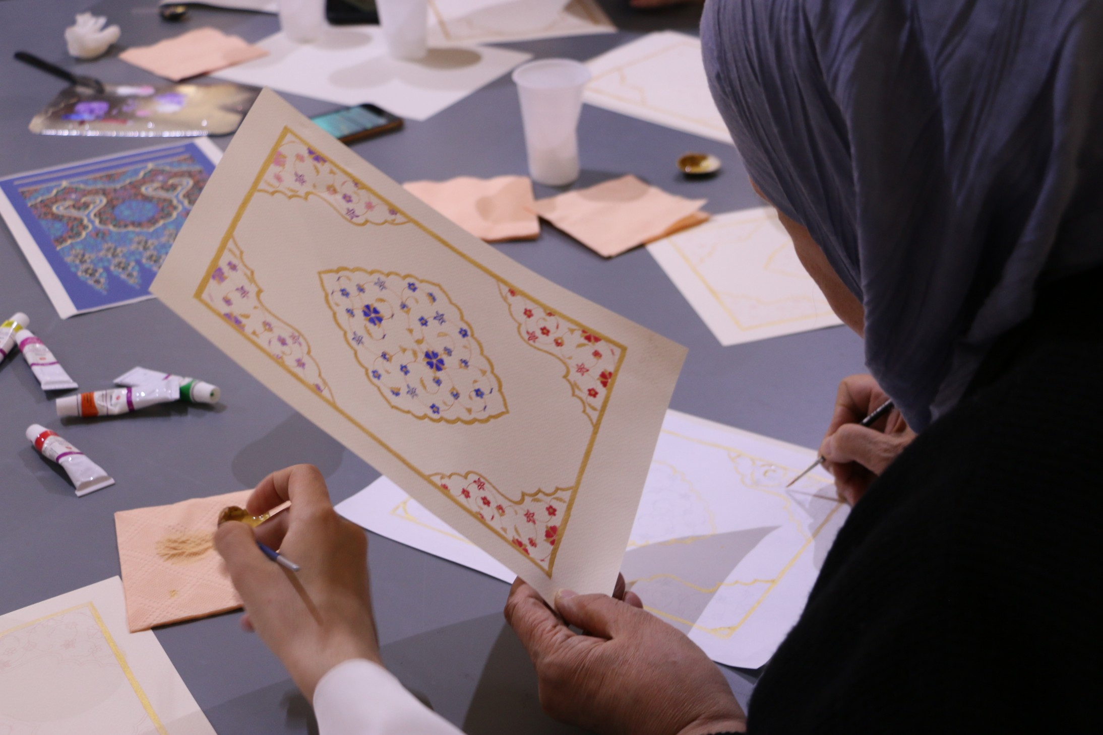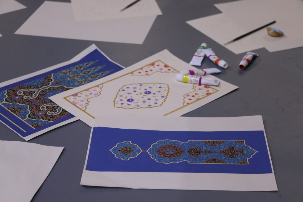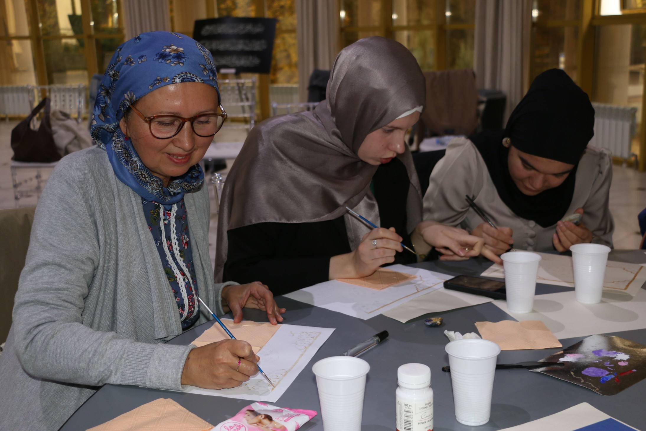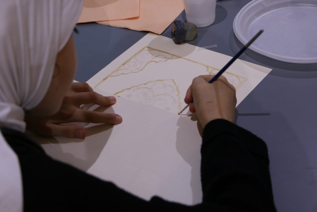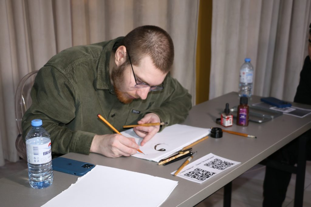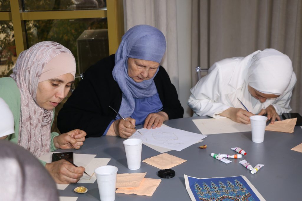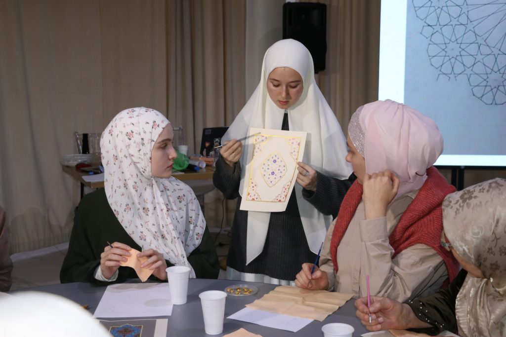 Второй частью мероприятия стал мастер-класс. Лейла Бузанакова предложила участницам встречи попробовать себя в написании узоров в специальной технике. Артур Писаренко наглядно продемонстрировал особенности арабской каллиграфии и в завершении мастер-класса написал имена участников мастер-класса в одном из распространенных стилей.