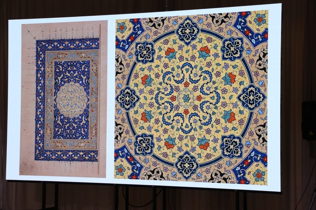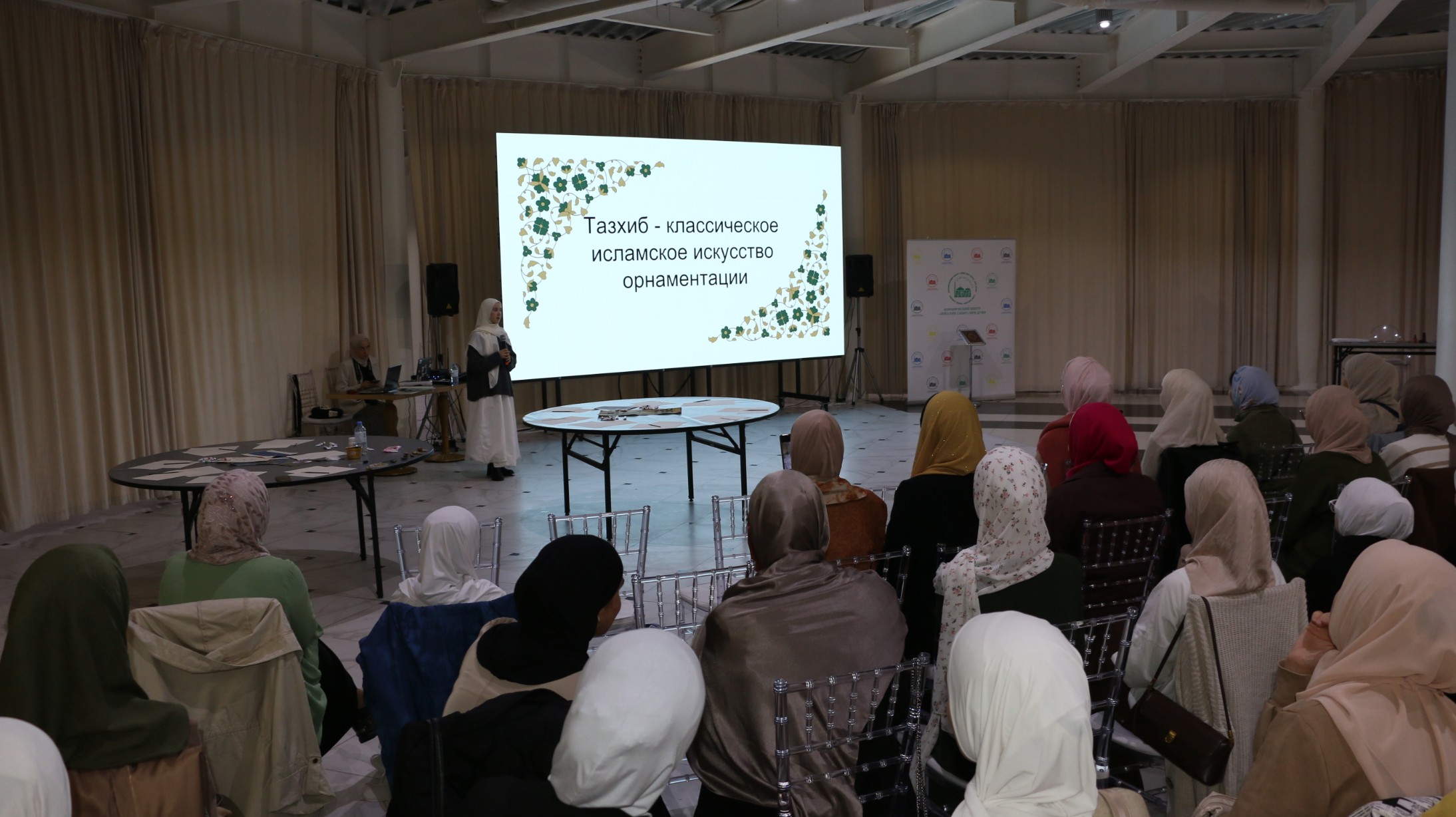 После небольшого перерыва студентка Центра арабской каллиграфии и исламских искусств «Ан-Намир» (г.Казань) Лейла Бузанакова познакомила участников встречи с тазхибом – классическим исламским искусством орнаментации. Рассказала о видах узоров, которыми украшаются страницы Священного Корана, картины с аятами и хадисами. Также собравшиеся узнали, где еще сегодня применяется тазхиб.