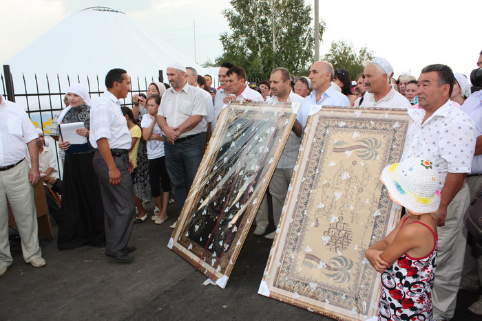 От Ассоциации национально-культурных автономий народов Саратовской области имаму Ават-хазрату Шунайбекову для мечети были переданы ценные подарки: шамаили (настенные полотна с сурами Корана) и денежный конверт.