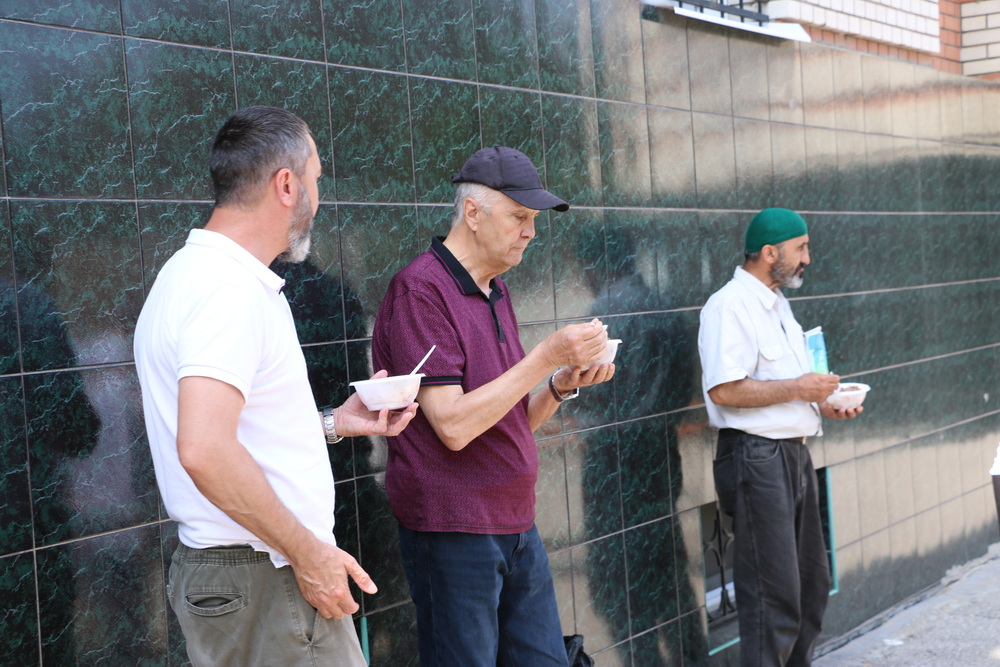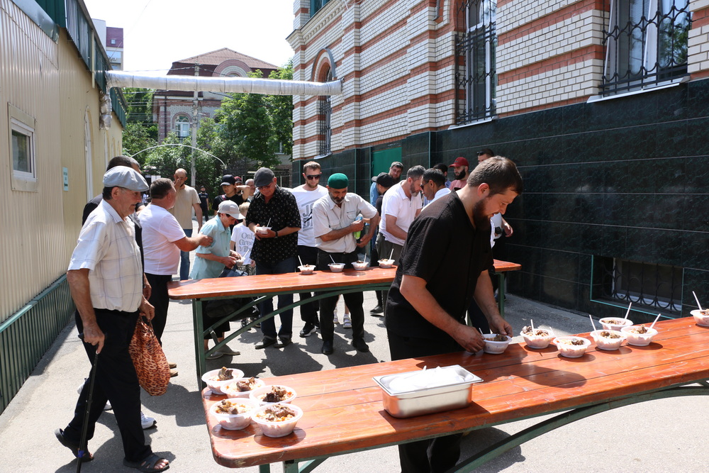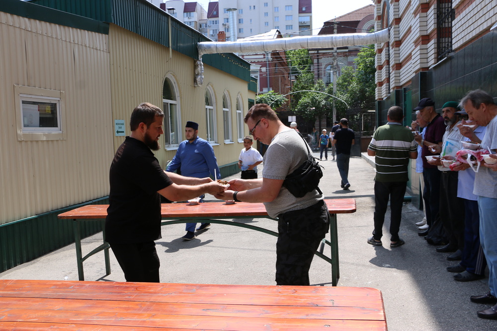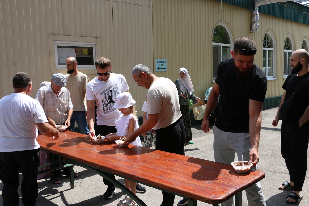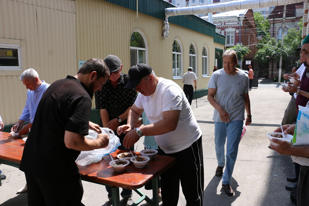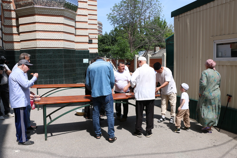 После Зухр-намаза отведать ароматные блюда могли прихожане Саратовской Соборной мечети, а также живущие по соседству с домом Аллаха и все желающие. Каждый благодарил за вкусные угощения и поздравлял с великим праздником. Мусульмане также просили Всевышнего Аллаха принять дуа и курбан тех, кто принес в жертву животных в дни Курбан-Байрама.
