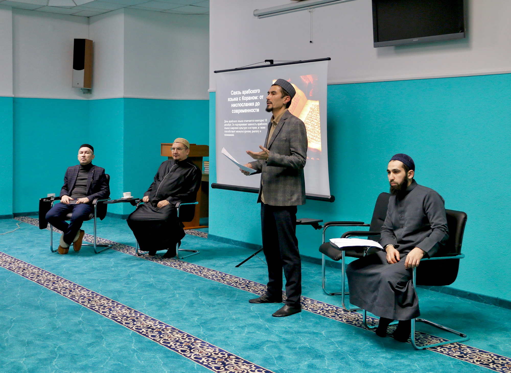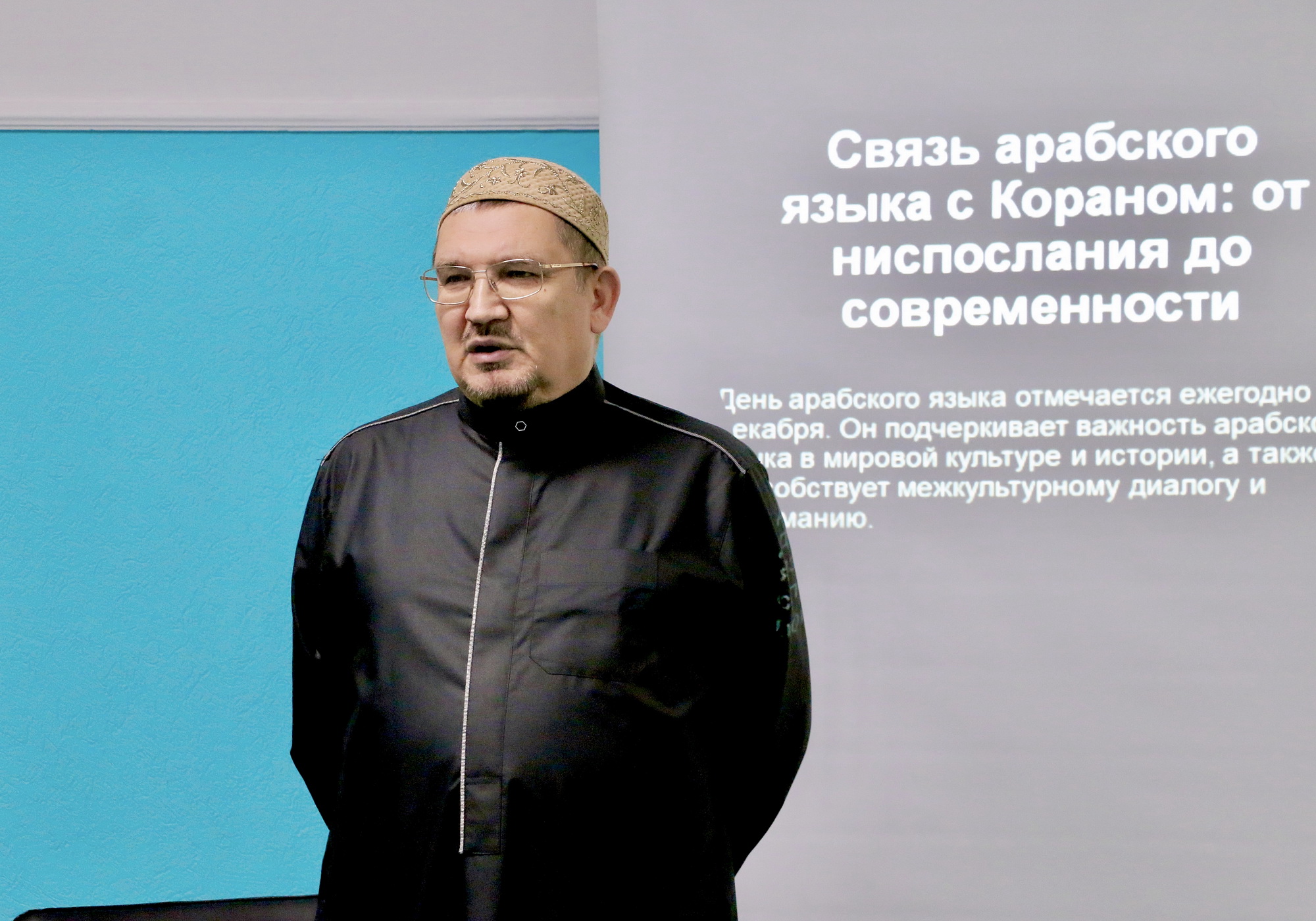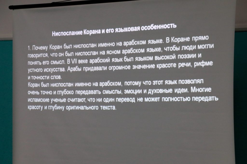 Имам-хатыб Саратовской Соборной мечети Камиль-хазрат Мамедбейли поведал о том, как великие ученые Ислама придавали особое значение детальному изучению арабского языка, хотя сами при этом были арабами. В частности, Камиль-хазрат подробно рассказал историю имама аш-Шафии, который несколько лет провел в изучении арабского языка, находясь среди одного из племен возле Мекки. Это указывает на то, что арабский является ключом к глубокому пониманию Ислама — на нем был ниспослан Священный Коран, переданы хадисы пророка Мухаммада (мир ему) и написаны многочисленные исламские научные труды. Также на арабском языке основана вся религиозная база – шахада, совершение азана и обязательного намаза, чтение Священного Корана, дуа и зикры, джаназа, обряды Хаджа и т.д.