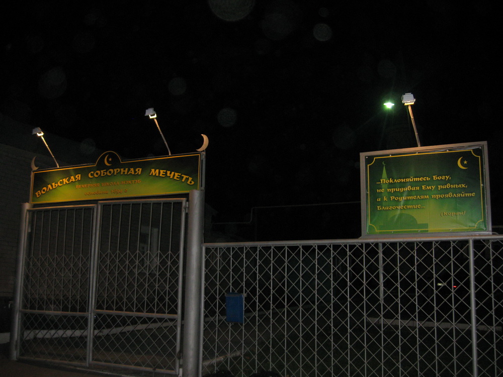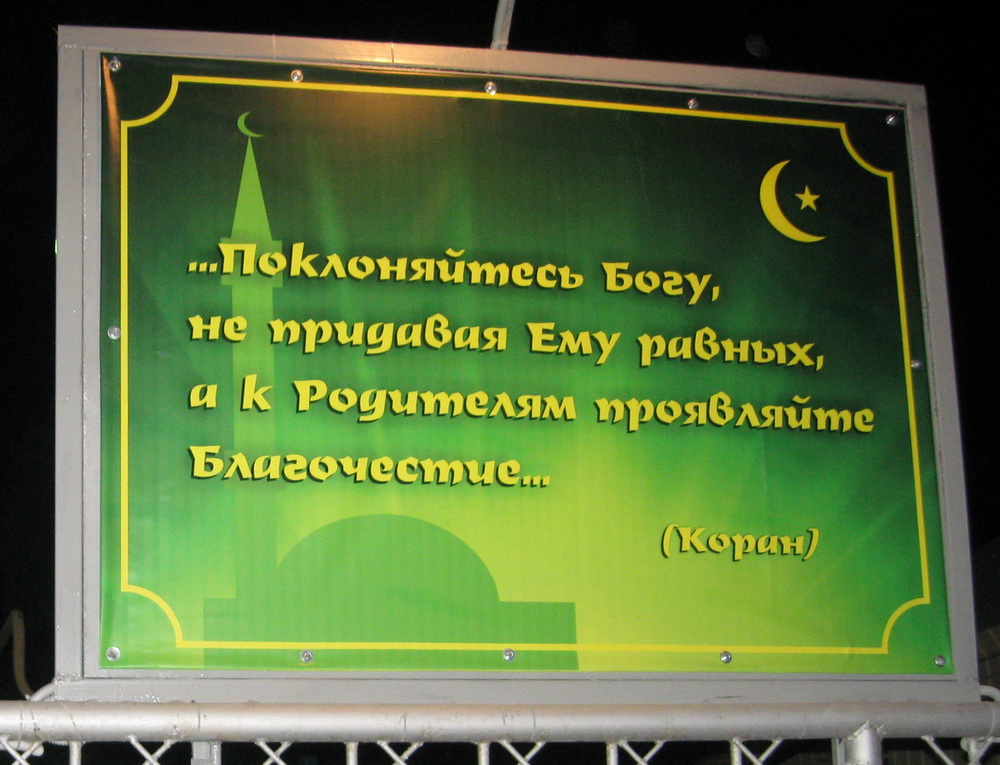 Стоит отметить, что баннер, который размещен на ограждении мусульманского храма, подсвечивается, поэтому слова из Корана видно прохожим и ночью.