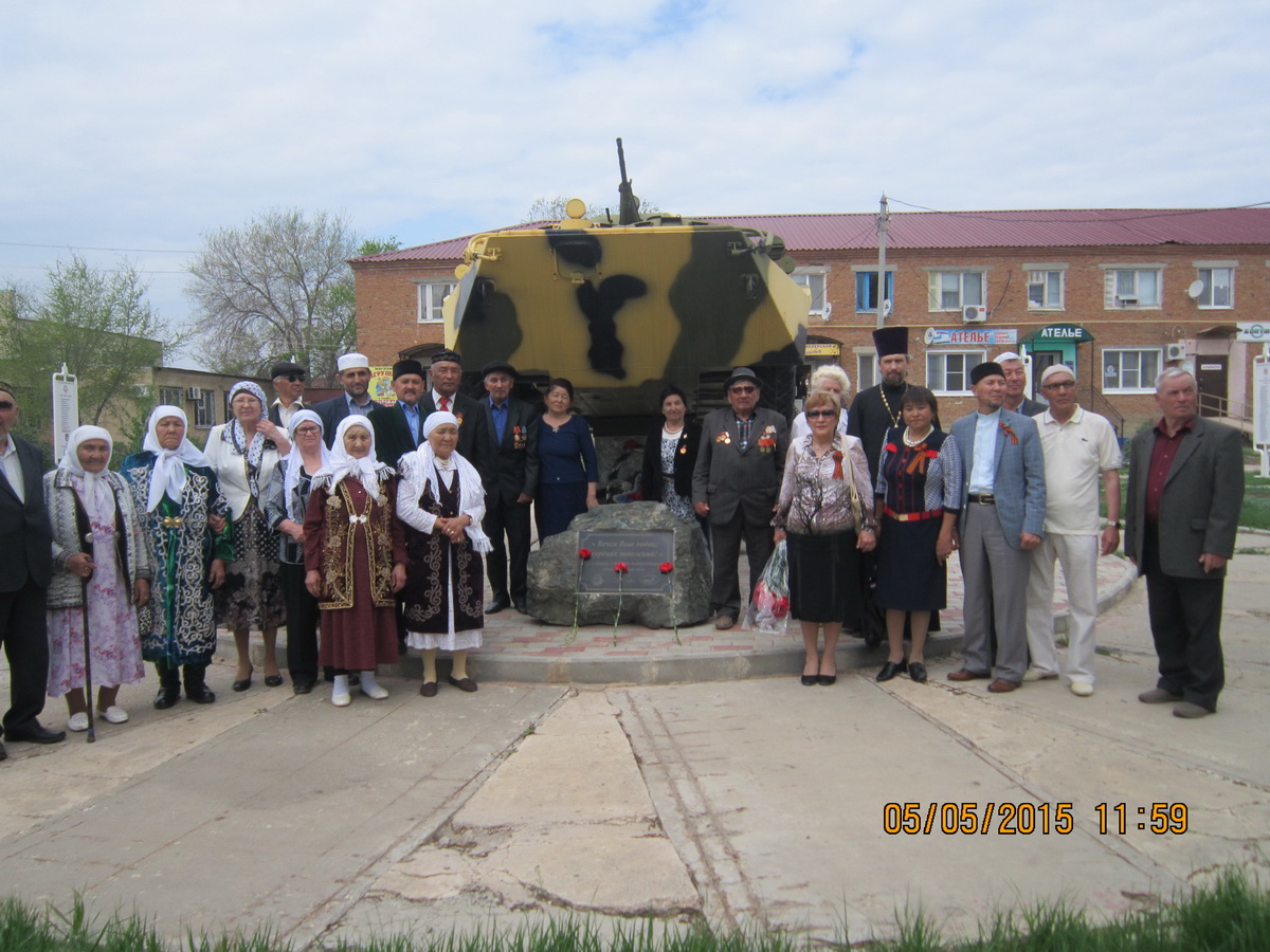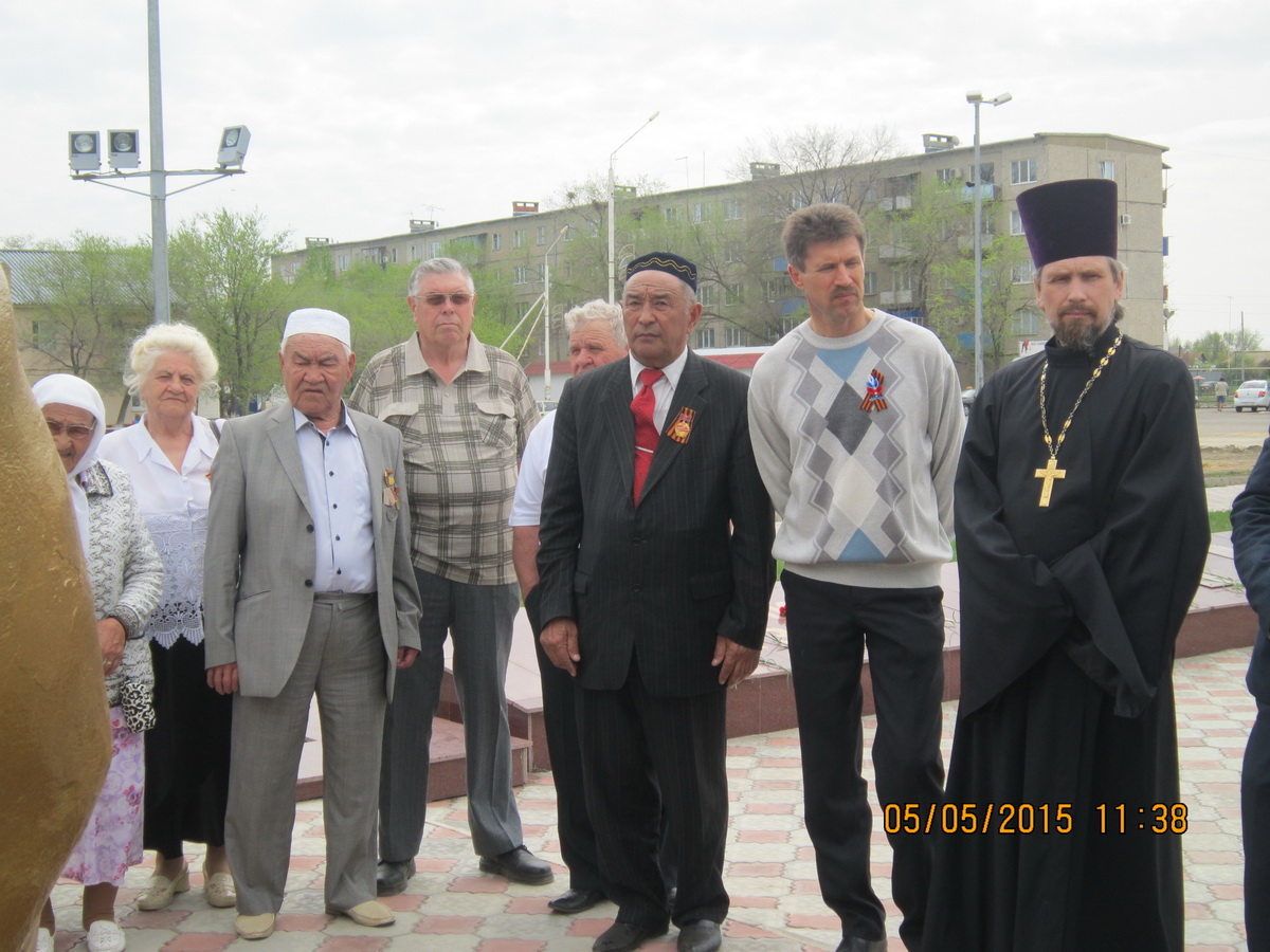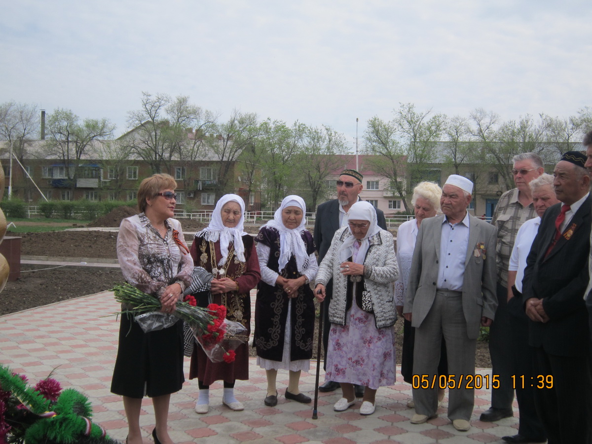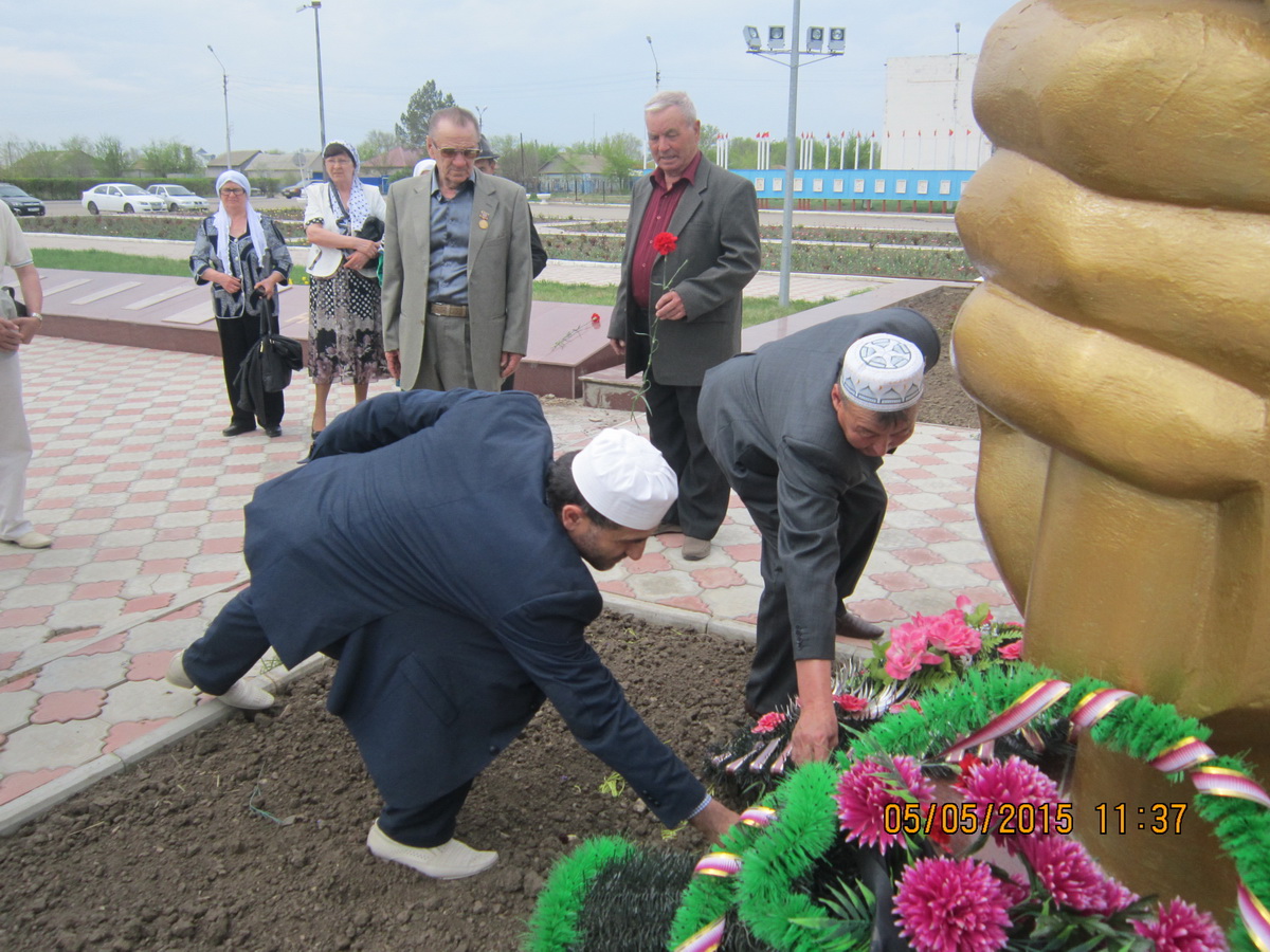 Возложив цветы к мемориалу боевой славы, собравшихся поздравил имам-мухтасиб Серекбай-хазрат Ирканалиев. После этого они прошлись по Аллее трудовой славы.