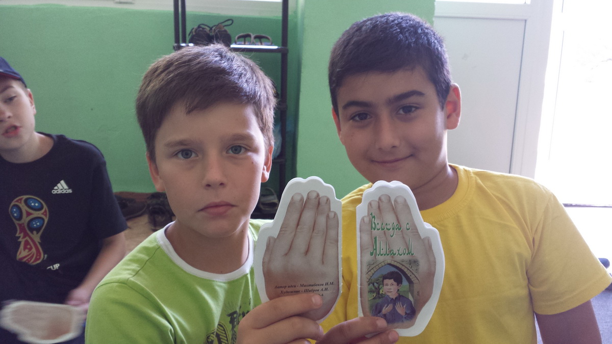 Во-первых, пособие для лагеря, увеличило свой формат: теперь книга стала больше размером и включила в себя ряд новых заданий. Дети с превеликим удовольствием осваивают материал и клеят наклейки, которые получают за успеваемость. Небольшая брошюрка «ладошки» с прекрасным названием «Всегда с Аллахом» учит детишек поминать Аллаха при каждом удобном случае.
