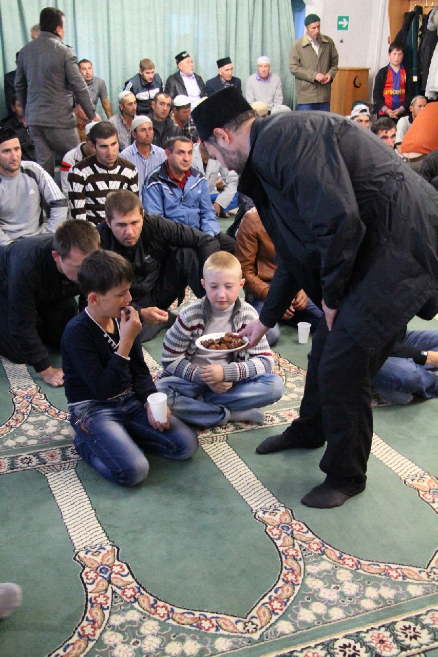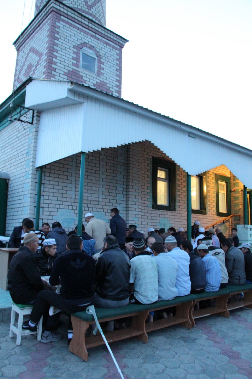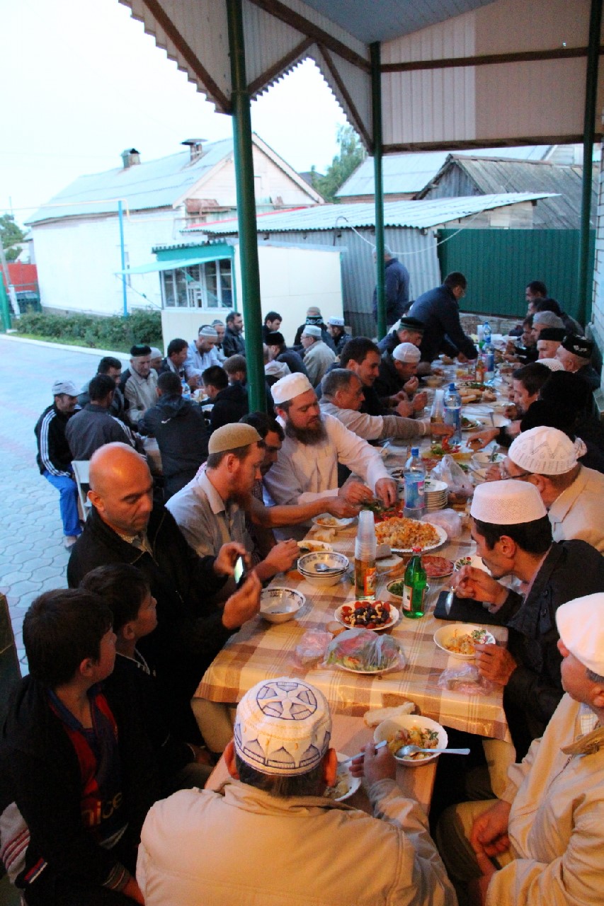 С первыми звуками призыва на вечернюю молитву собравшиеся завершили свой пост финиками и водой, совершили коллективный намаз и приступили к трапезе, которая к этому времени ждала всех во дворе мусульманского храма.