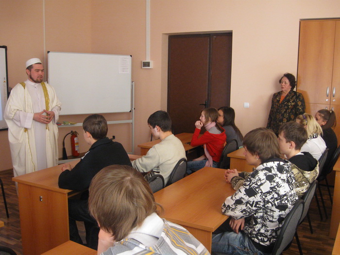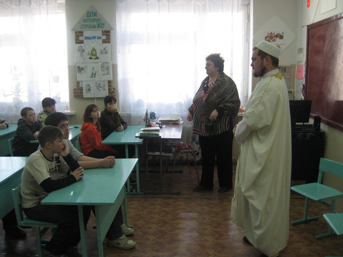 На прошлой неделе имам Вольского района Абдулхаким-хазрат Яфаров провел уроки в 6 и 9 классах общеобразовательной школы города Вольска Саратовской области. Несмотря на то, что наш регион не вошел в список тех, где в школах вводится преподавание основ религиозной культуры, вопрос остается актуальным и для Саратовской области. Поэтому рассказ вольского имама об исламской религии в школах как учителя, так и ученики слушали с глубоким интересом. Абдулхаким-хазрат поведал ребятам об истории возникновения Ислама, о пяти столпах и основах веры.