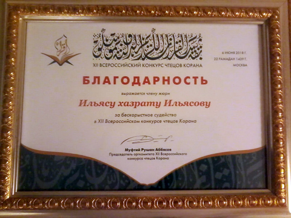 Всем участникам Всероссийского конкурса вручили грамоты и памятные подарки. Также всем членам жюри была выражена благодарность от имени председателя Совета муфтиев России и ДУМ РФ шейха Равиля-хазрата Гайнутдина.