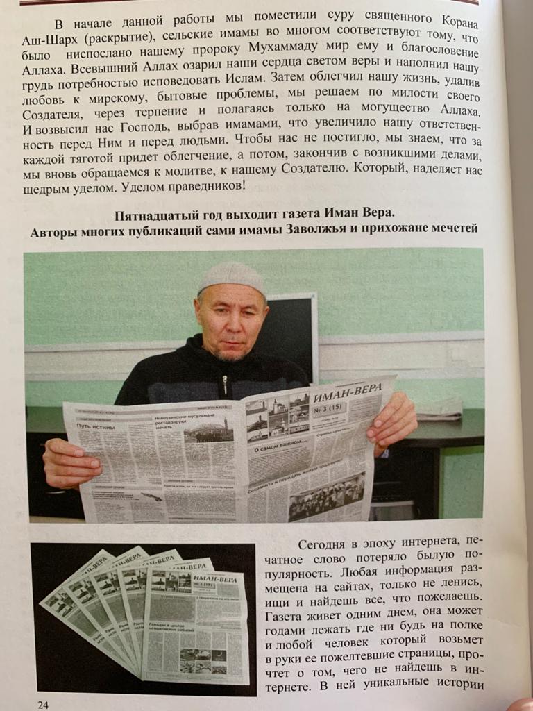 На более чем 40 страницах рассказывается о многолетней просветительской деятельности имамов заволжских районов Саратовской области, их работе по воспитанию подрастающего поколения и пропаганде здорового образа жизни. Так, например, уже 15 лет при мечетях Заволжья проводятся летние лагеря дневного пребывания для детей, организуются ежегодные курсы повышения квалификации сельских имамов и активистов мусульманских общин. На протяжении 14 лет издается газета «Иман – Вера».