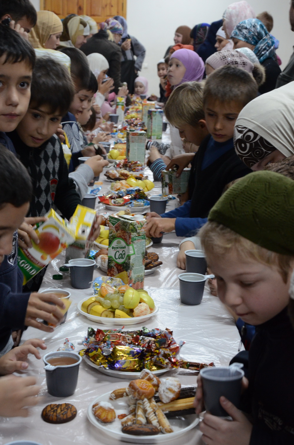 После окончания воображаемого Хаджа и «паломники», и «ожидавшие» их дома друзья и родные смогли насладиться праздничным фуршетом — прямо в Исламском комплексе были накрыты столы с фруктами, сладостями, соками и чаем. Верующие продолжили общение, обмениваясь поздравлениями с Курбан-байрамом и впечатлениями от увиденного детского представления.