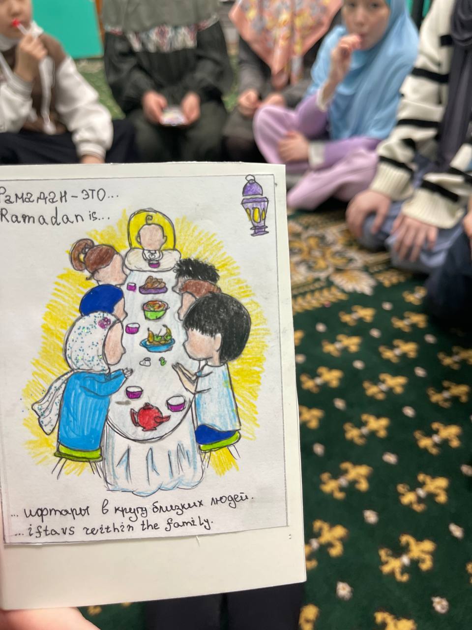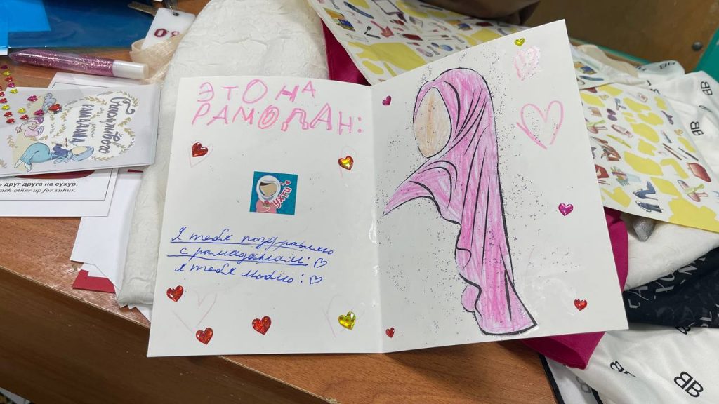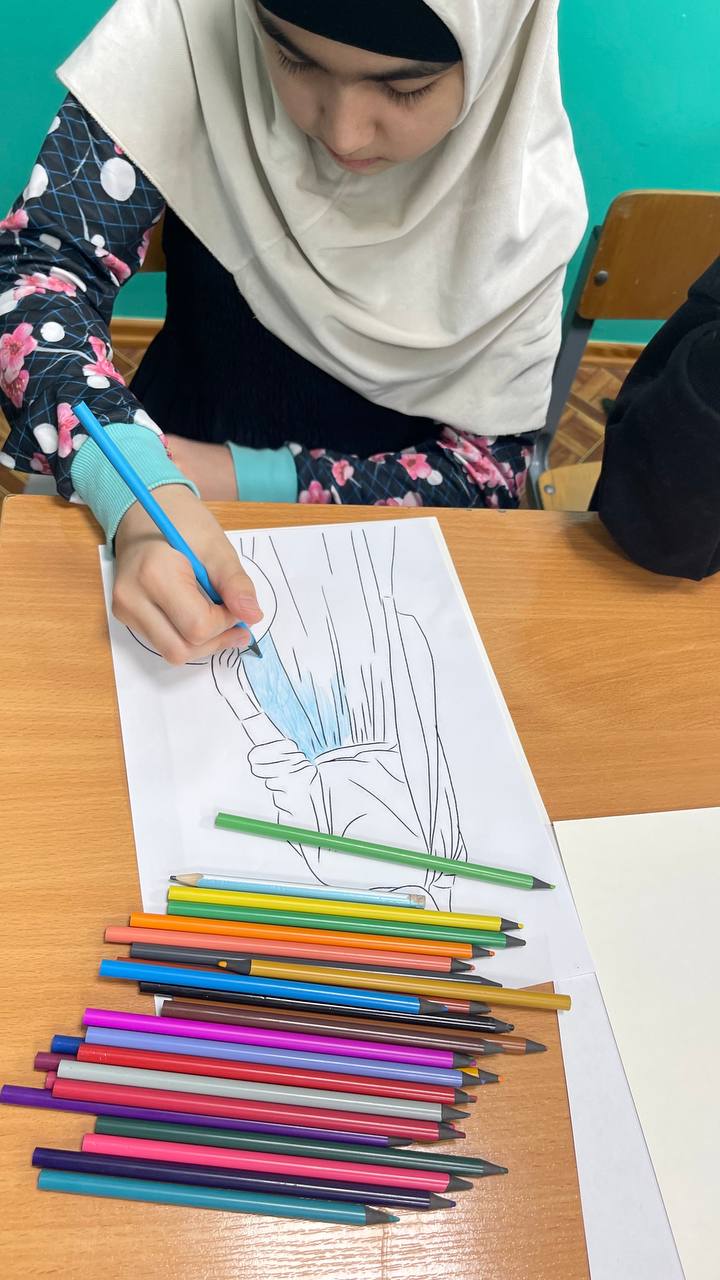 Девочки проявляли фантазию, вооружившись клеем и ножницами, раскрашивая картинки и придавая им выразительность всевозможными способами. При этом повод для рисунков мог быть любым на выбор автора. Кто-то создавал открытку к приближающемуся Рамадану, кто-то писал теплые слова своей маме или бабушке…