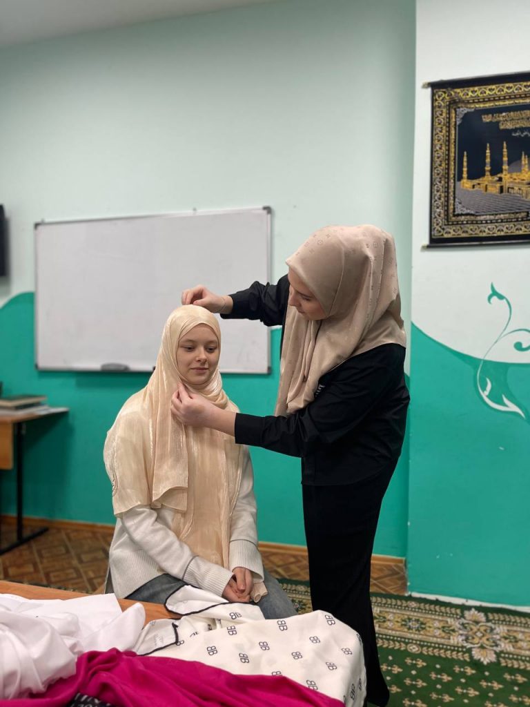 Если младшие курсы были полностью поглощены художественным творчеством, то старшекурсницы также приняли участие в мастер-классе по повязыванию платка. Ведущая показала подросткам различные виды хиджабов и способы их ношения.