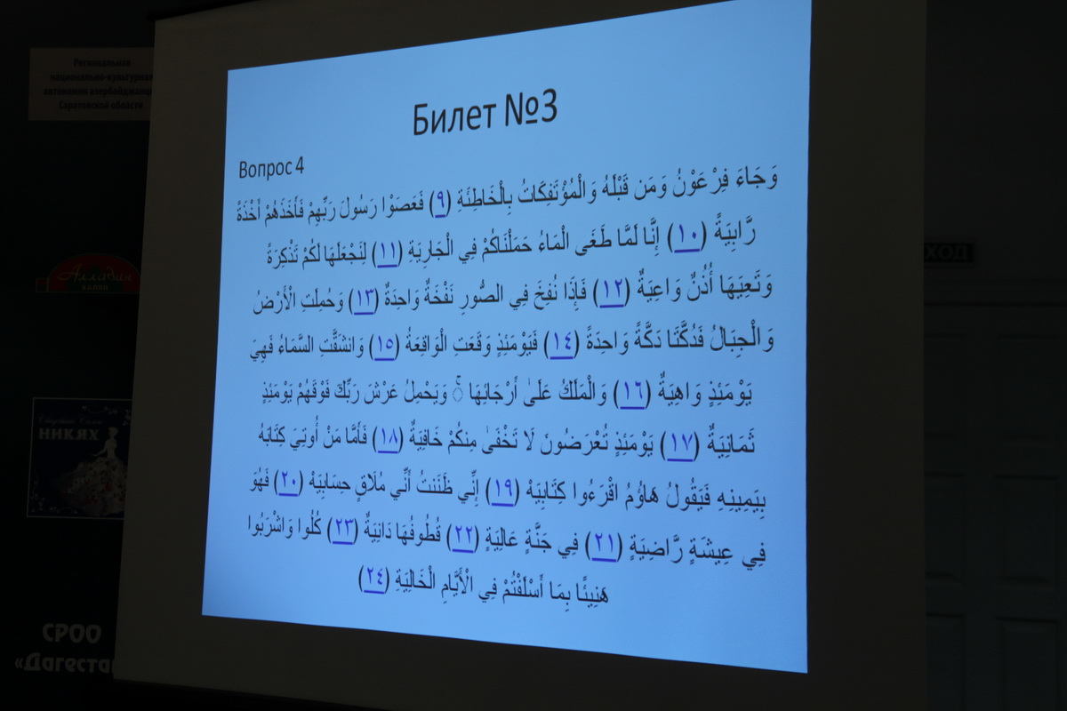 Помериться своими знаниями Книги Аллаха в губернию приехали участницы из Казани, Махачкалы, Мордовии, Пензенской и Ульяновской областей. Саратовскую область представляли одиннадцать из 26 конкурсанток, среди которых были как совсем юные, так и взрослые чтицы. Накануне, в субботу, состоялся отборочный тур, по итогам которого в финал конкурса прошли 18 знатоков Корана.