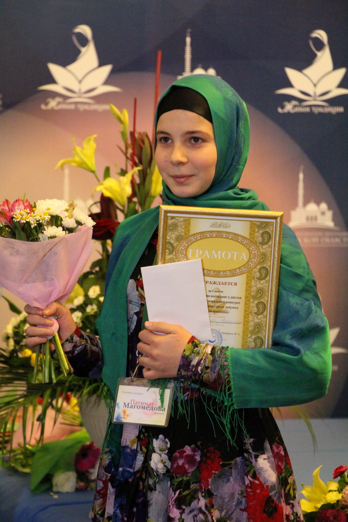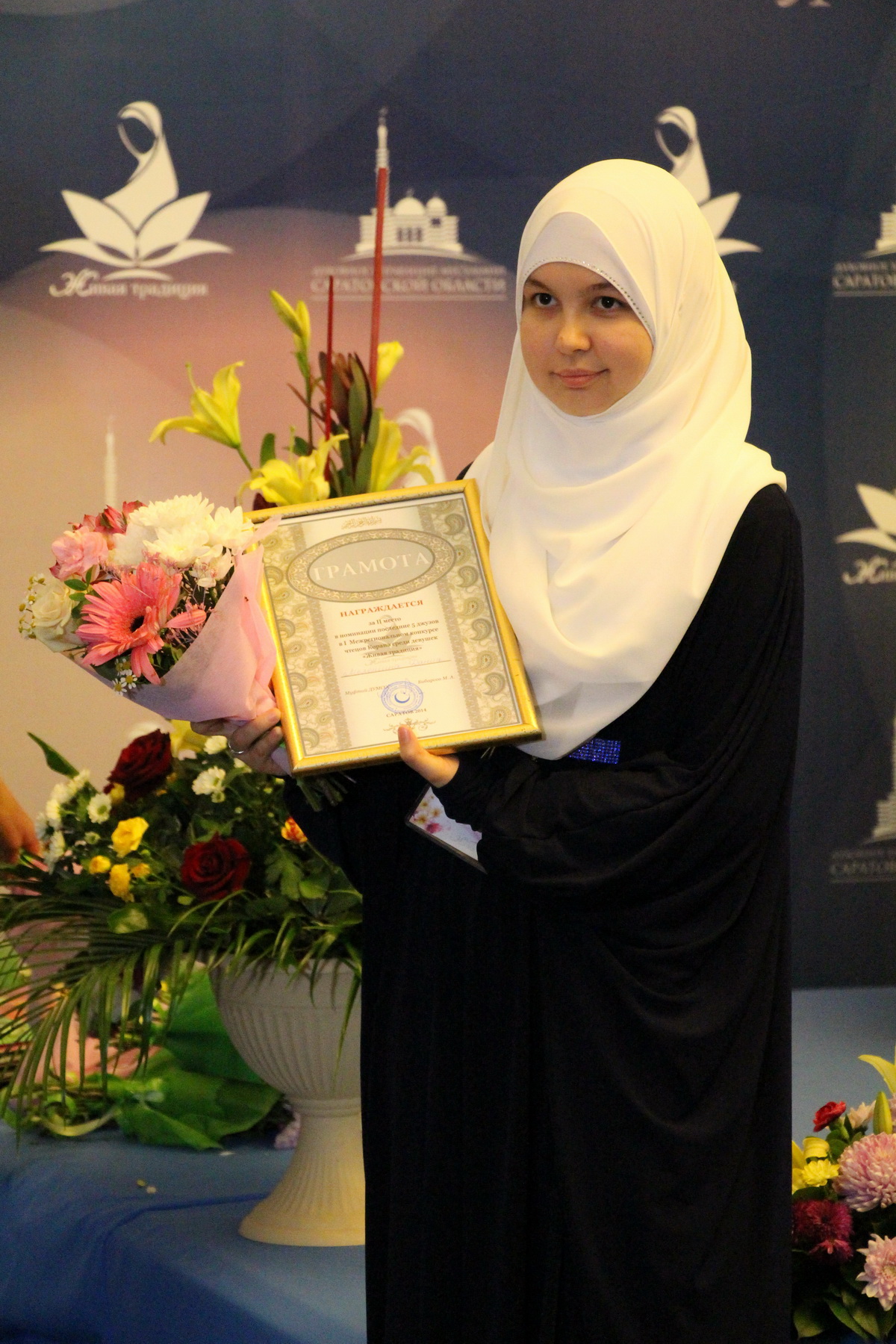 И наконец, в самой сложной части конкурса, где девушек экзаменировали на знание десяти джузов (1/3 Корана), третье и второе места заслуженно разделили Нурия Бибарсова из Казани и Патимат Магомедова из Махачкалы (тезка и однофамилица конкурсантки из предыдущей номинации) соответственно, а абсолютным лидером конкурса стала саратовчанка Елена Дмитриенко.