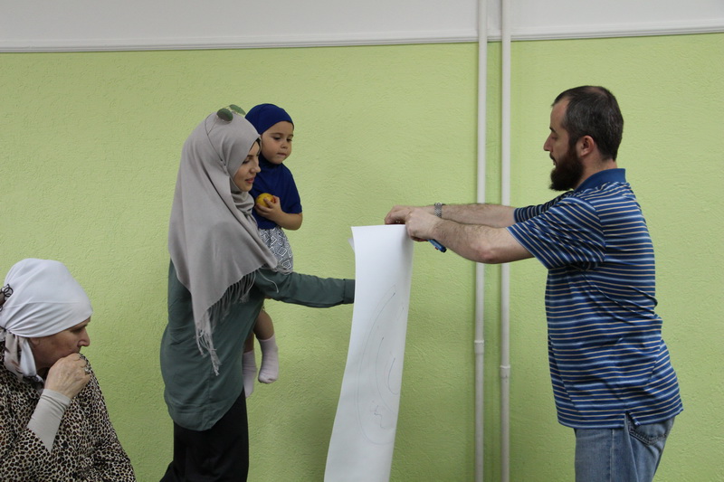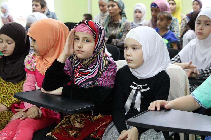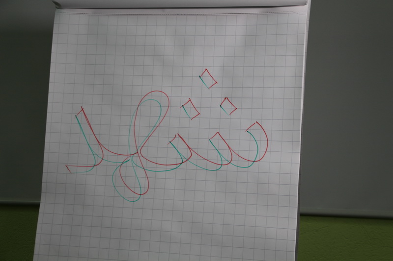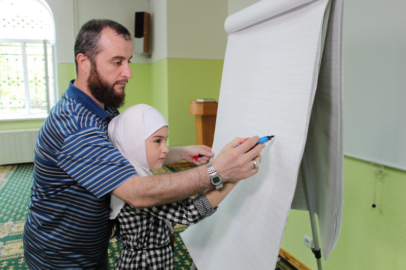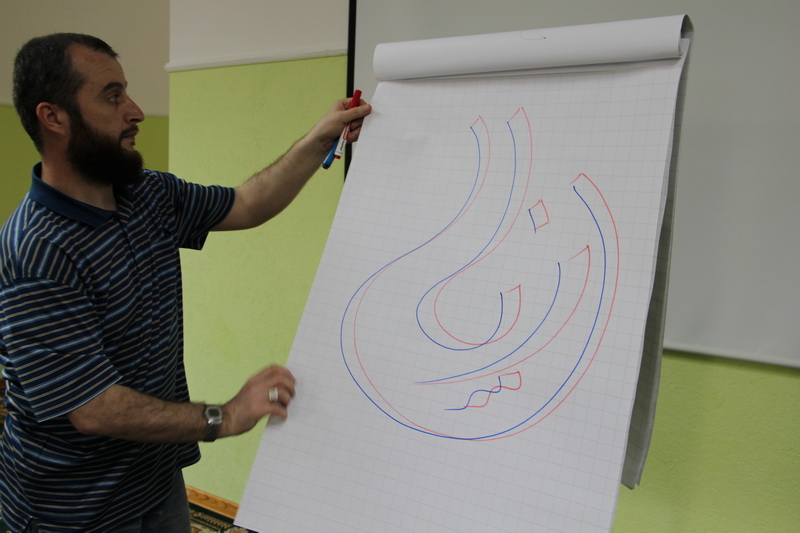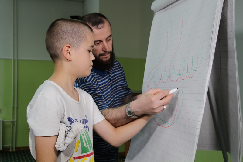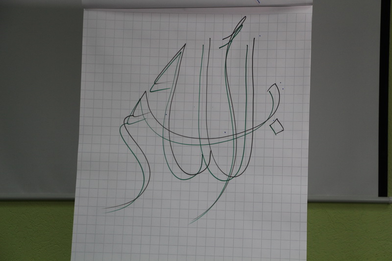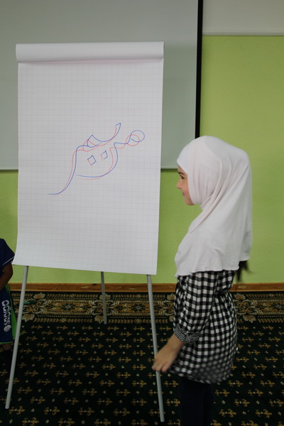 Завершив исторический экскурс, Ильяс-хазрат перешел к практической части мероприятия. На листах бумаги с помощью обычных маркеров он изобразил в разных стилях басмаллу («бисмиллях», «с именем Аллаха»). После этого собравшимся задавались вопросы о Коране — сколько аятов в Священной Книге мусульман, первой суре, где был напечатан первый экземпляр и т.д. Правильно ответившие дети становились героями мастер-класса – они не только получали листы со своими именами, написанными в каллиграфических стилях, но и сами могли попробовать сделать это с учителем.