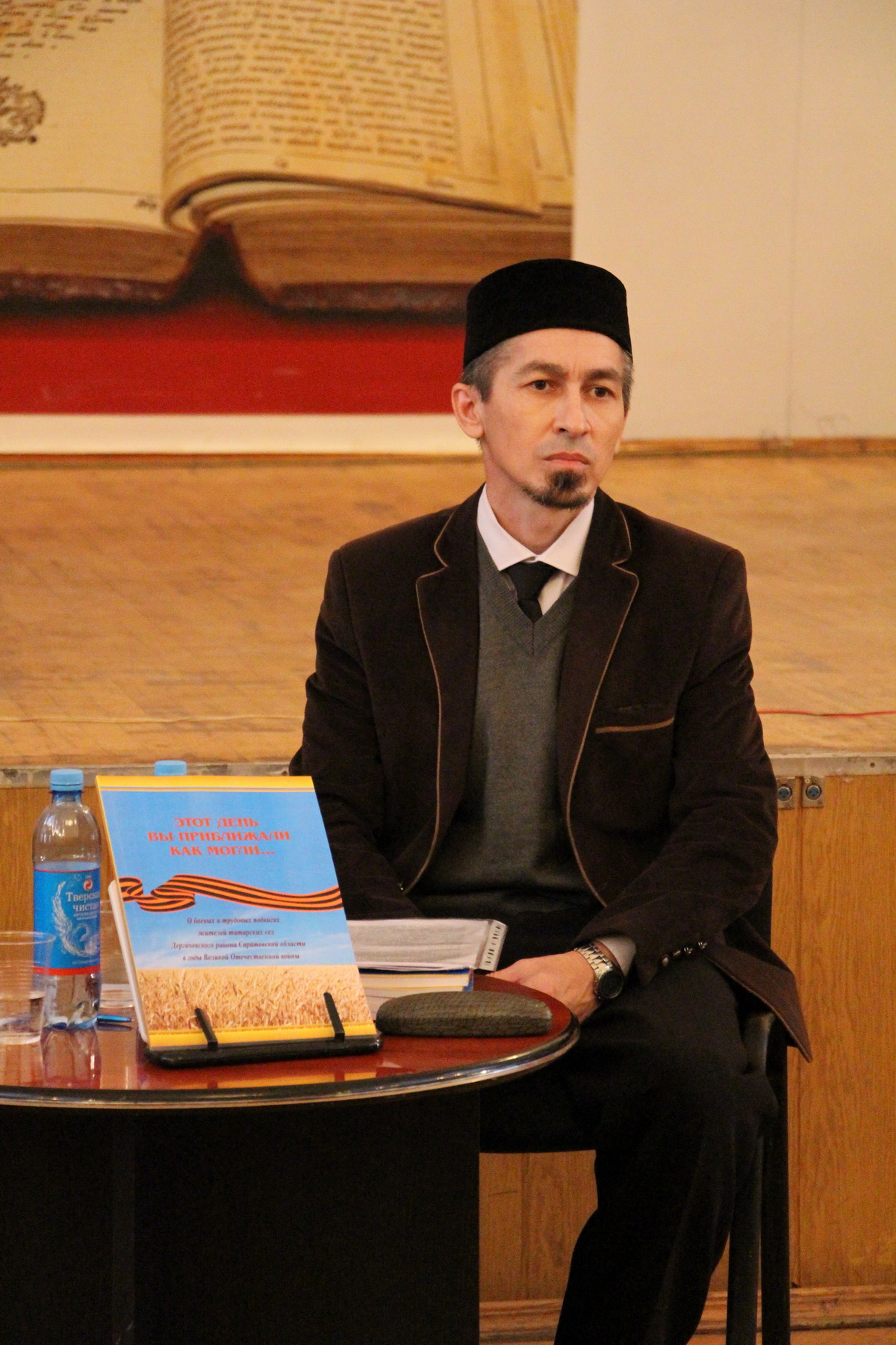 После этого Али-хазрат Хабибуллин напомнил, что более 530 тыс. саратовцев сражались на фронтах войны. «Более пяти тысяч человек были призваны из Дергачевского района, три тысячи из них – жители татарских сел Алтата, Сафаровка и Верхазовка», — сказал он и подчеркнул, что написание книги считает долгом перед теми, кто отстаивал свободу своей страны, теми, у кого стоит учиться мужеству и стойкости.