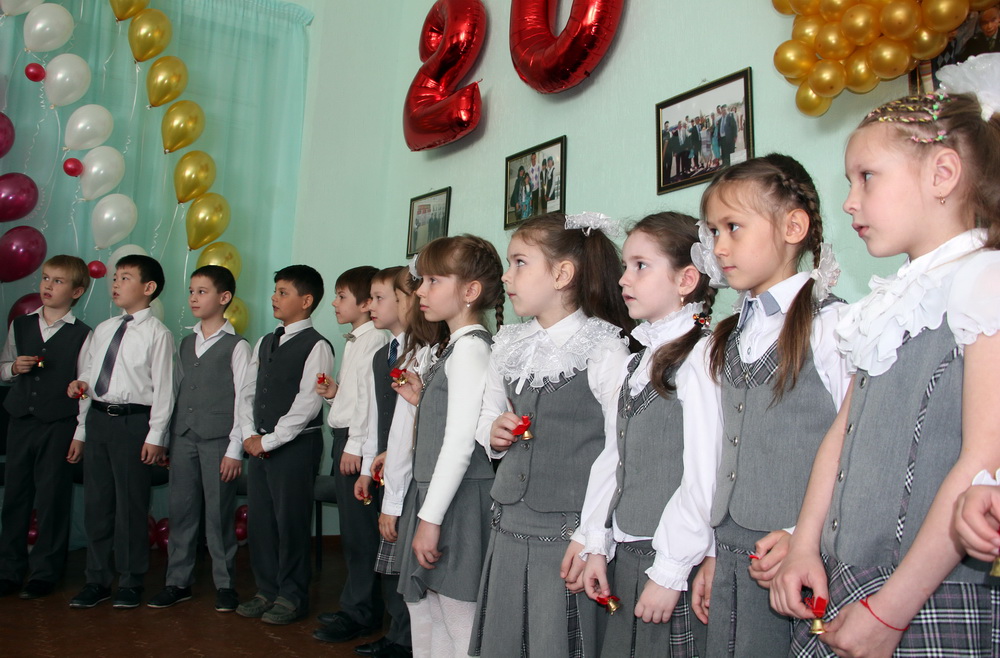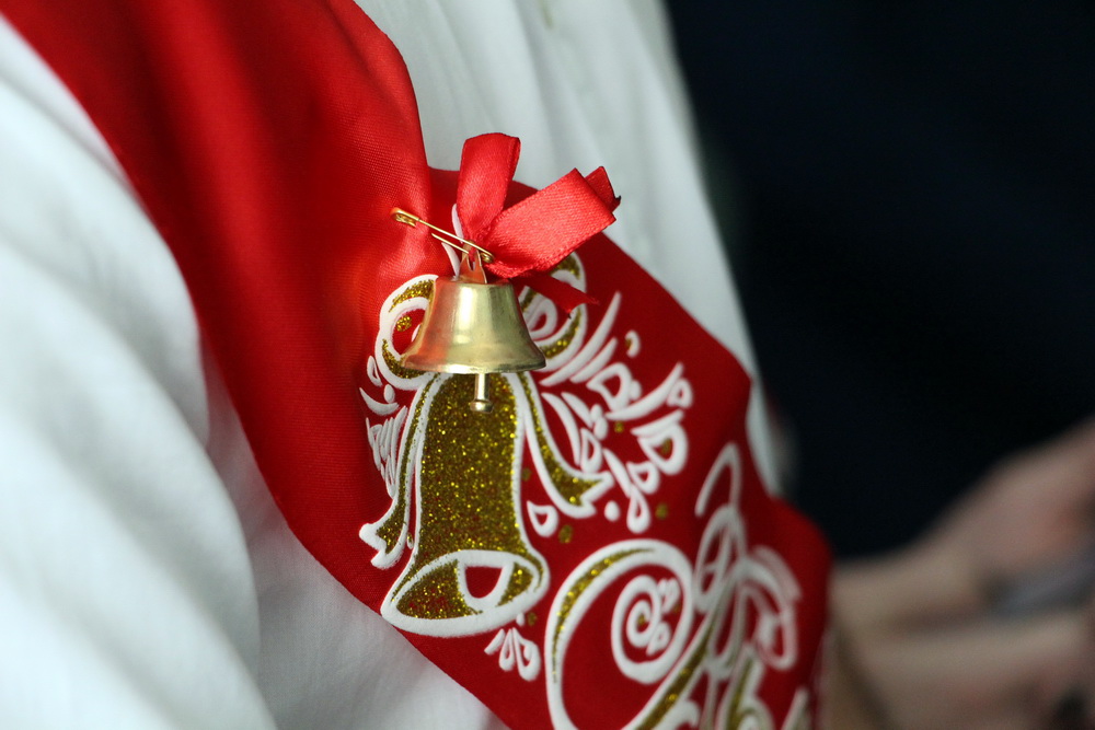 В праздничный день своих старших товарищей поздравили и первоклассники, которые прочитали стихи и вручили им маленькие колокольчики.